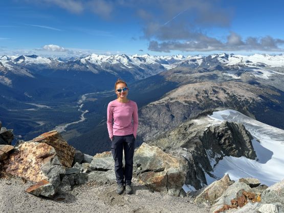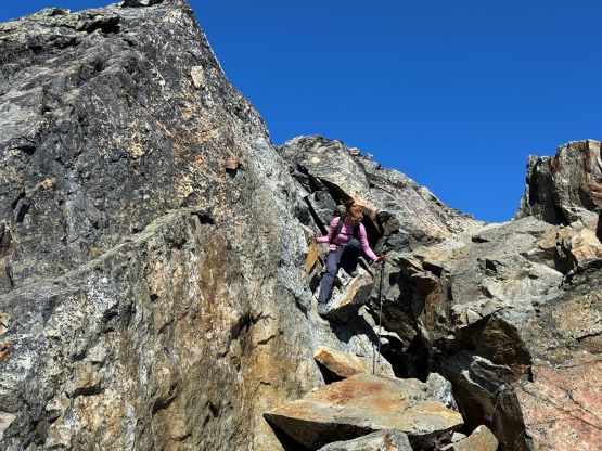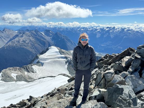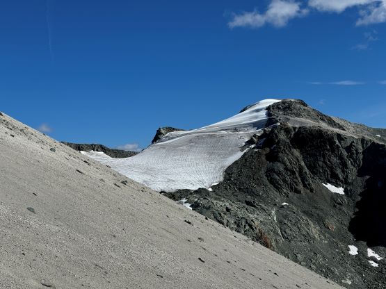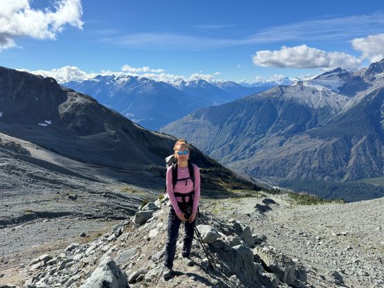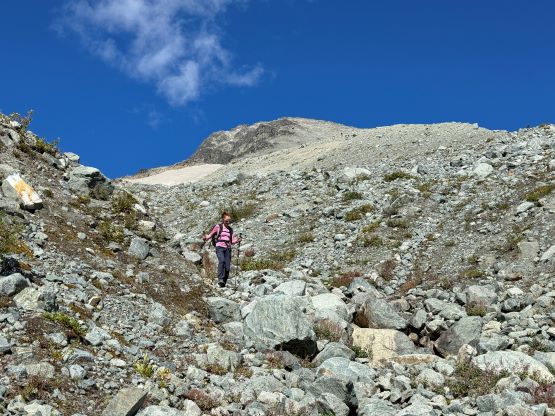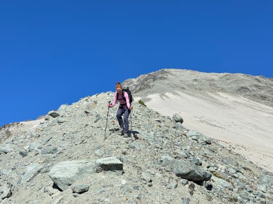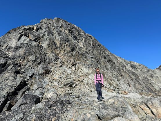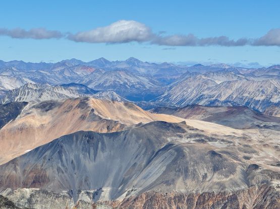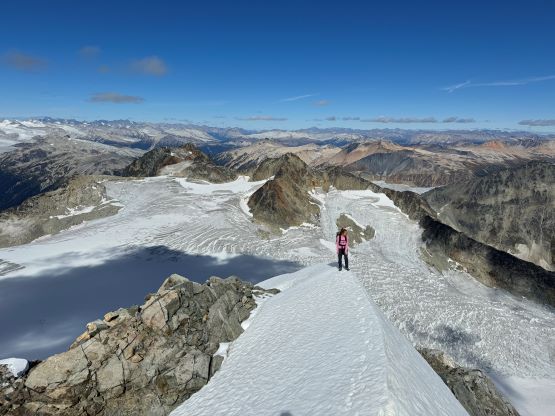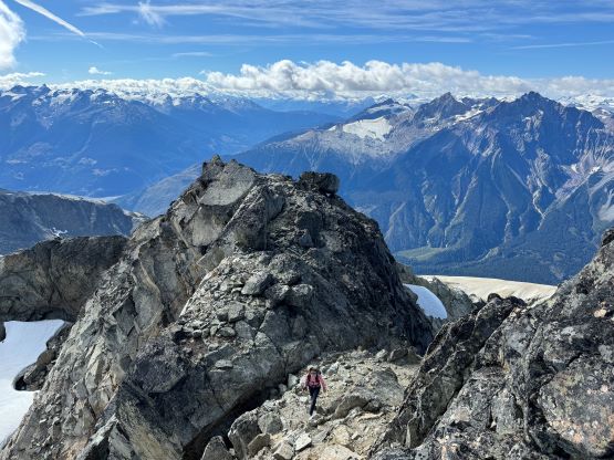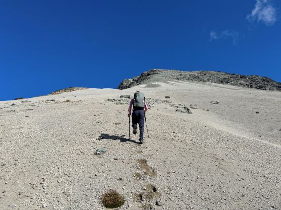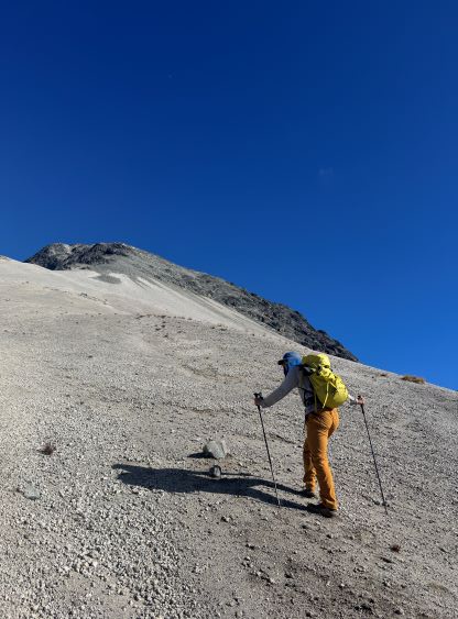 We eventually traversed onto a moraine crest and followed this crest for at least 100 vertical meters to the base of the infamous pumice slope. In retrospect we should have kept the traversing even more flat and that would bypass this moraine crest. The moraine was far from “fun” and definitely required some caution but I told Erica that the one I ascended on Mt. Cayley was five times worse, so might as well take this as a practicing oppourtunity. The pumice wasn’t as bad as what people made it sound like, but it was definitely a tiring treadmill game. I made Erica to go ahead for the maximum amount of experience and I had to made additional “trail-breaking” on top of her tracks. I honestly thought this was quite interesting as the slope wasn’t never-ending so the post-holing was sort of refreshing from the tiring grunt on the various other types of choss. I found the slog to the false summit from the top of this pumice field was the most tedious as the terrain was monotonous and we were already sort of tired by this point. For the final traverse to the true summit along the south ridge we opted to stick as close to the crest as possible dealing with numerous 4th class steps. The scrambling was longer and more challenging than expected. I however thought most, if not all of the 4th class challenges could be bypassed if needed. Our ascent time was 4 hours so the day was still young. The clouds were also lifting so we lingered on the summit for quite a while to fully soak in the experience.