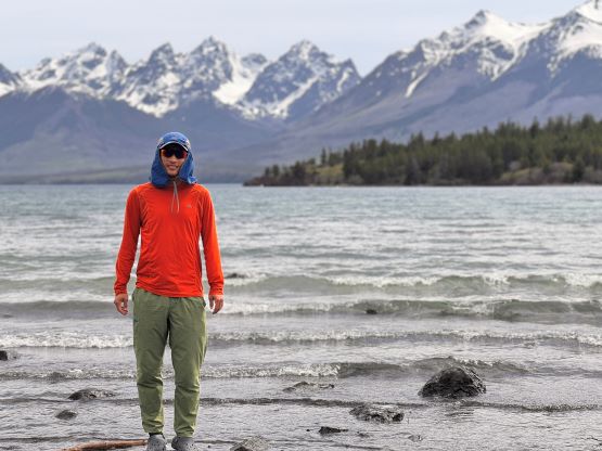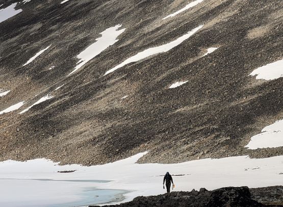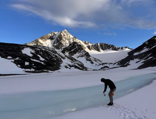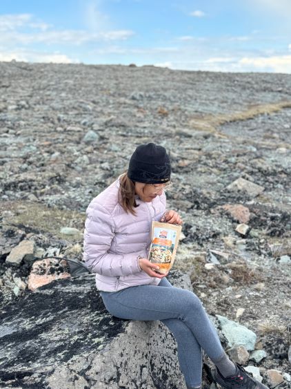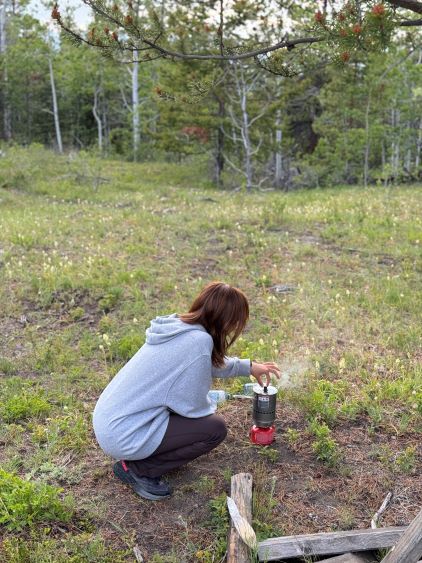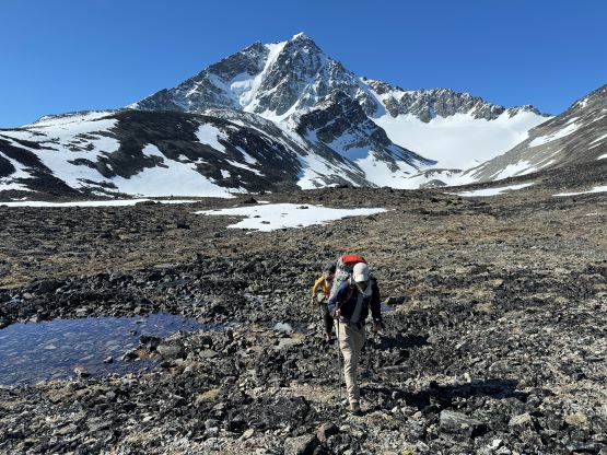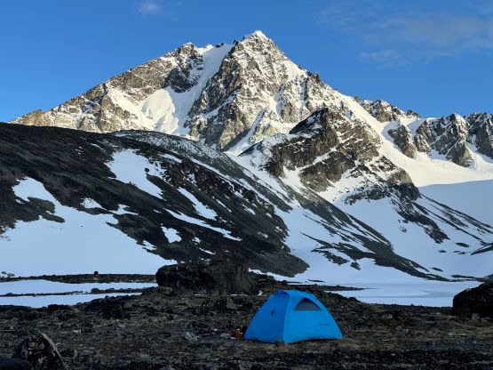 The trail basically ended somewhere there but we were mostly in the alpine anyway. The next section involved linking up several patches of open grassy slopes. The bushes were dense in between the patches of open but Matt had picked an excellent route and all we needed was to stick to his GPX as if it’s the god’s sake. Once entering the alpine I made some adaptations and took a more direct bearing in between Matt’s ascent and descent tracks. The area where Matt mentioned “swamps” sucked no matter what and I do not think there’s actually a better way. It wasn’t too swampy for us, but the bushwhacking through those dense unknown type of low growth was unavoidable. Thankfully it didn’t last too long, and we were soon facing that foreshortened diagonal grunt to the “lake camp”. Erica and I took over the lead for the rest of the approach and having Erica right on my heel made me going quite hard. Adam and Dave had to hit the maximum gas and we together made to the camp in just over 3 hours from the truck. There was thankfully enough melting along the lake’s rim for us to collect liquid water, but elsewise I only gave us 20 minutes to take a much needed break while setting up the tents. None of us carried a bear spray but Dave had brought an Ursack which we all appreciated, especially after the grizzly sighting that was not that far away.