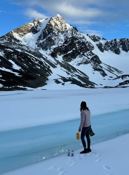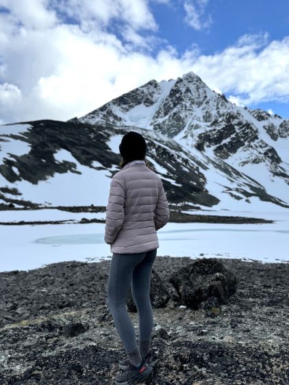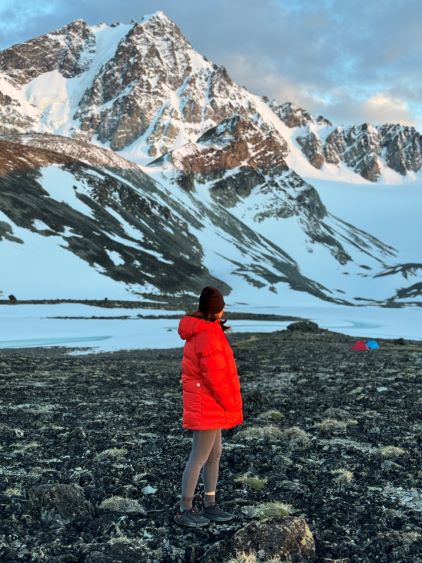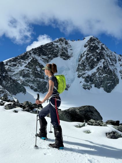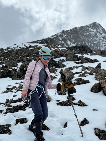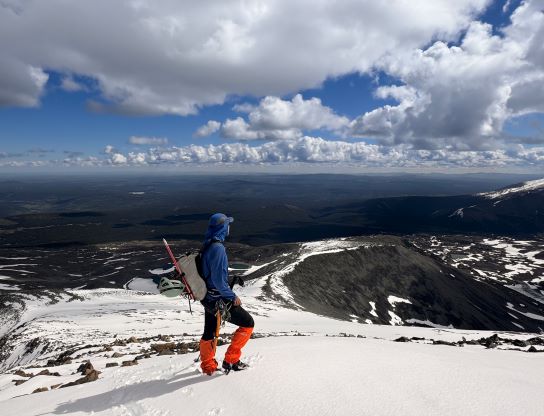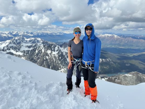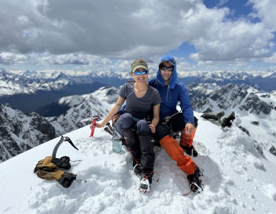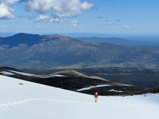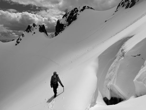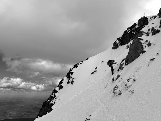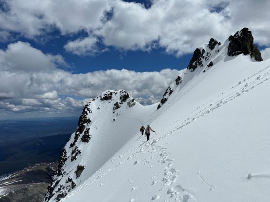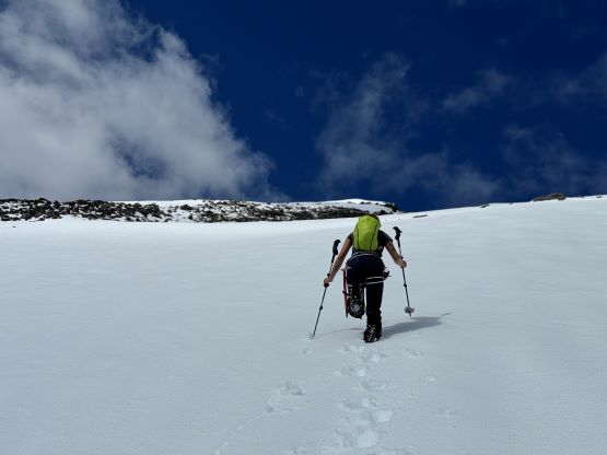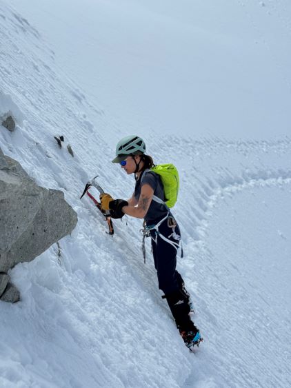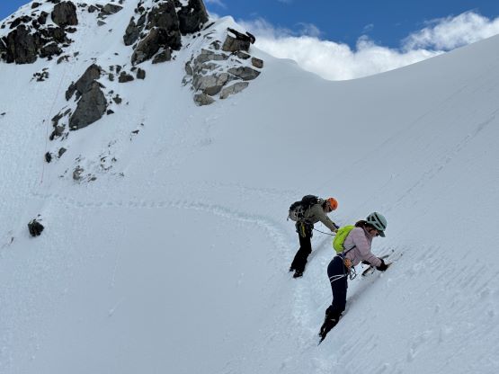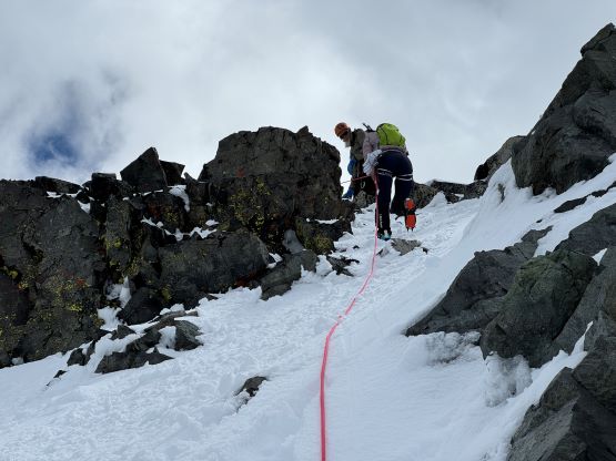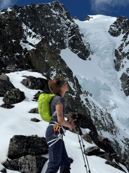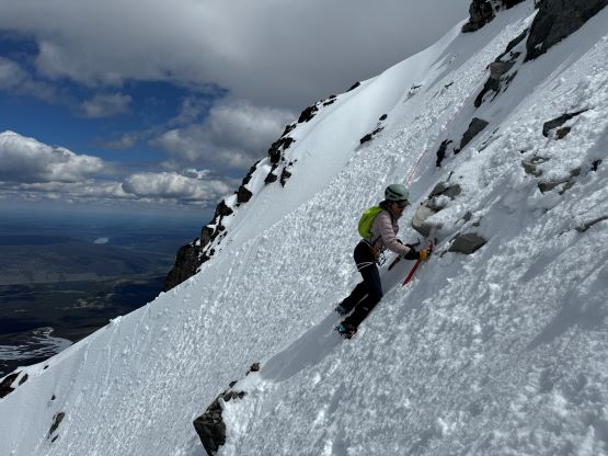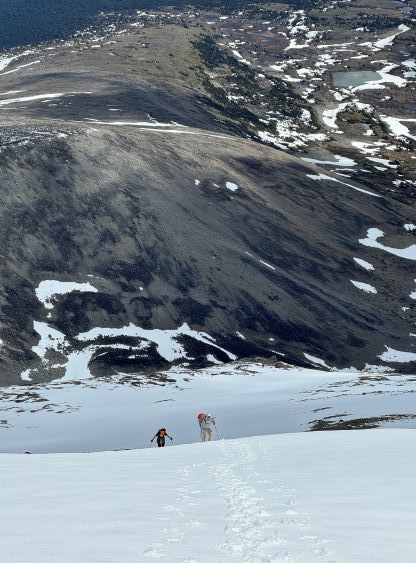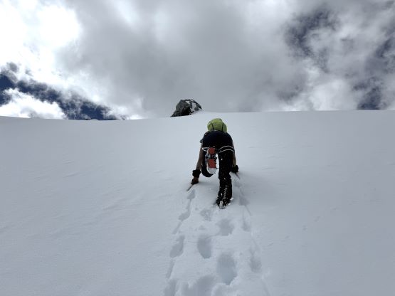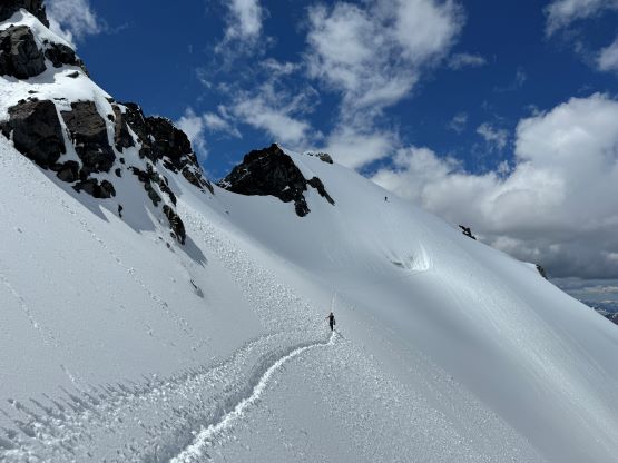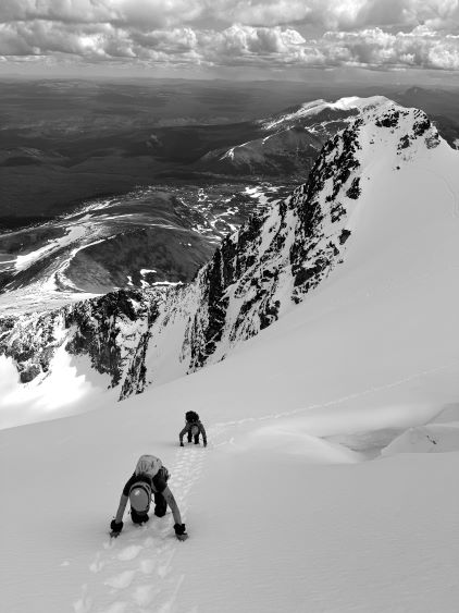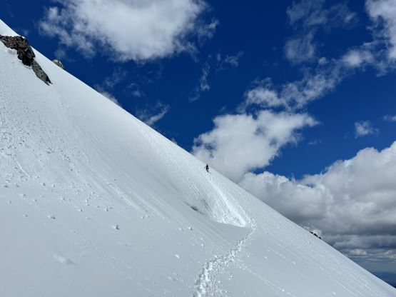 We had together brought two ropes, two ice axes each and one snow picket. I firstly inspected Matt’s “au-cheval” which was unfortunately melted out. It was doable, but I liked the snow chute option. To make things more fun I decided for us to make one single strand rappel and leave the rope fixed on the false summit for the return, and that would be my 20 m “scrambling rope”. The anchor was easily made using Dave’s picket, and Dave would carry the other rope down in case we needed that for the glacier crossing. Erica had never done a rappel before but both Dave and I were able to teach. I ended up going down first to scout things out, and Dave took the rear end. The traverse afterwards was worse than I thought, with 500 m exposure straight down the north face icefalls so I made some gigantic bucket steps for Erica to follow. I could have crossed much faster but group safety first. I also gave Erica my Petzl Quark and swapped for her aluminum ice axe, so my combo was Camp Corsa Nanotech plus Petzl Gully. We did brought the steel crampons and proper mountaineering boots and we definitely appreciated that. Frankly speaking, the snow traverse was literally nothing compared to the difficult peaks that I did earlier in the year such as Pyroclastic Peak, but this was definitely one of, if not the most exposed snow climb that Erica had ever done. I led us taking the lower option traversing to the climber’s right side of the open crevasse. The final 50 m was on some not-too-terribly steep snow so after a short while I made Erica to lead us to the top, and of course once she took over the lead I was unable to catch up until the very summit.