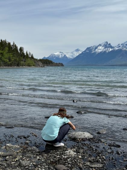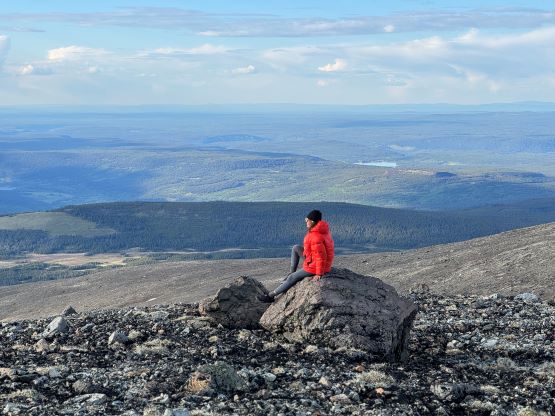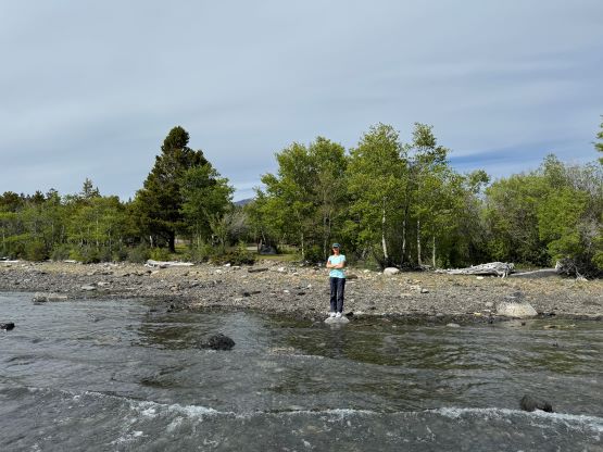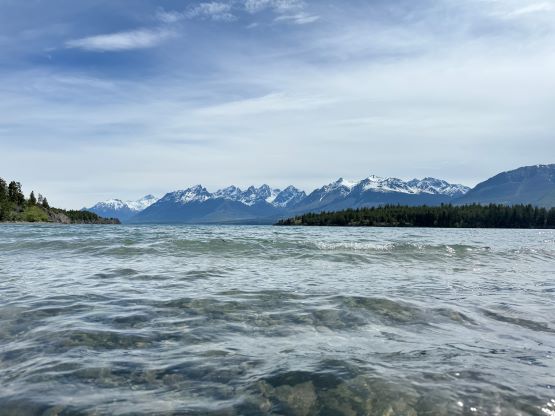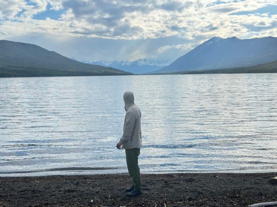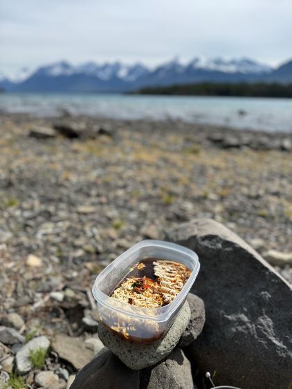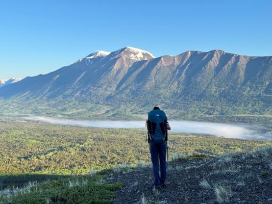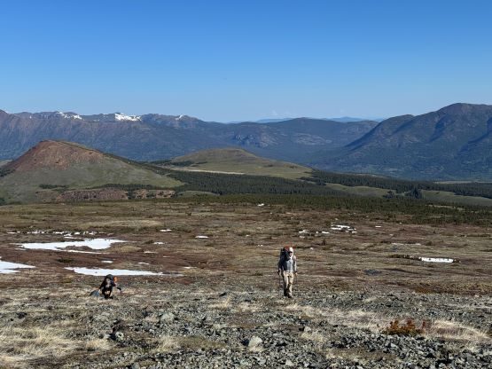 Fortunately the grizzly did not come to grab his burgers and burritos. The next morning we woke up naturally at around sunrise but slept in until almost 8 am. Another hour later the camp was broken and another hour later we were down at the saddle of that P200m bonus objective. I did the entire navigation mostly holding the phone on my hand because I did not want to do extra work. I explored a higher line around that bushwhacking zone but did not find a definite better way. The grizzly was nowhere to be seen, so we ditched the backpacks and ran up that bonus peak. There was fair amount of choss to content with. The view looking back at Mt. Tatlow was great but otherwise this was a pure peak-bagging add-on. I then made Adam to lead us back to the truck but he was also cruising at a fairly fast pace, and as mentioned earlier we tried a different way to cross that creek, but failed to find a definite better solution. The log made for a dry crossing but it was far from straightforward. Dave lost a pole and Adam had to build some additional “bridges”. I again, made two trips back and forth to carry Erica’s pack over. This option also involved more bushwhacking than our wet-feet crossing on the way in, so pick your poison. Our vehicles were still intact so after the trail-head routine we quickly drove away. Erica directed us to Nu Chugh Beniz campground on the shore of Chilco Lake using my phone, and we spent the rest of the day chilling and enjoying our time in such a remote part of our home province.