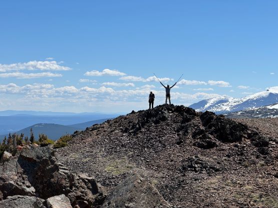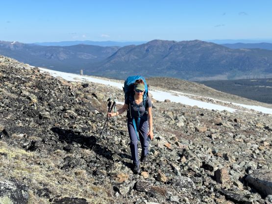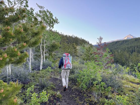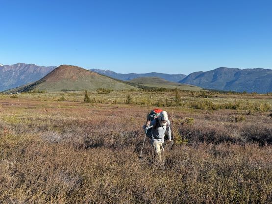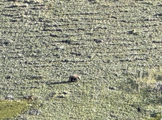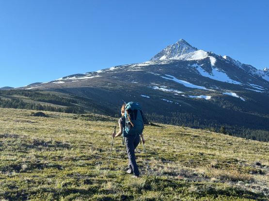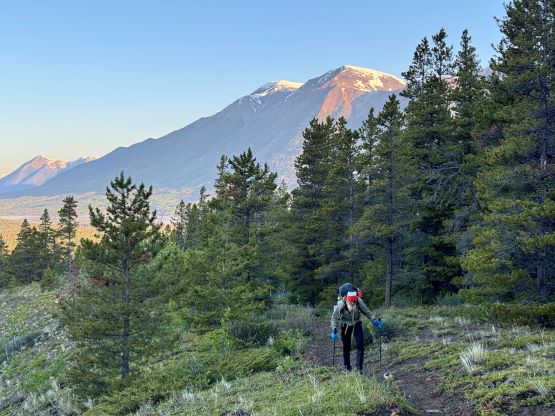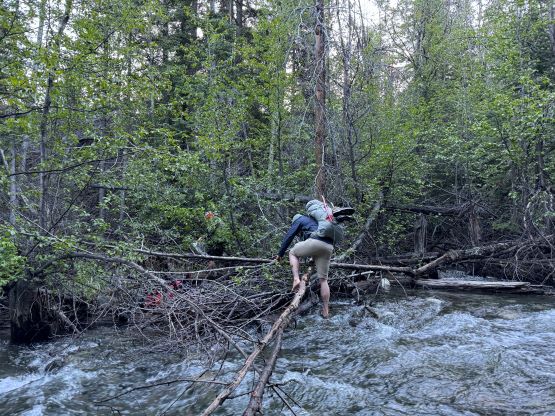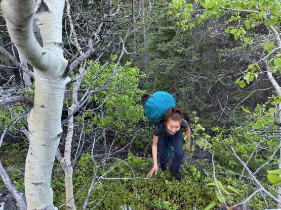 On the next morning we woke up at 4 am and was ready to go by 5 am. The plan was to push to the “lake camp” and make the summit on the same day, and there was some thunderstorms in the forecast in the afternoon so we needed to be quick. One crux presented near the start and that was the creek crossing. I believe the horse trail on the other side of the trail does not originate from our driving route, so we had to thrash through the bushes both ways to find a suitable crossing spot. On the way in we strictly followed Matt’s GPX but had to take the boots off and wade across. The current was quite strong and the bare feet crossing would be very painful and difficult so I made two trips and carried Erica’s pack as well as my own across as Erica had never done a river crossing before. My feet were frozen after the first ferry and I needed several minutes to warm them up before making the second crossing. On the return we crossed downstream and used a sketchy log, which was better but not necessarily safer. Adam then set a blistering pace up the horse trail probably because he wanted to be out of the sight for as quickly as possible, but frankly speaking I don’t think the locals use this trail by much, if at all. There are several overgrown stretches but with Matt’s GPX track the navigation was very straightforward. We took the first needed break under the P200m bonus bump where we saw a monstrous grizzly minutes after. Thankfully the plan was to hit that bonus peak on the exiting day.