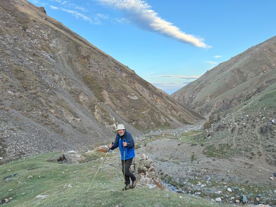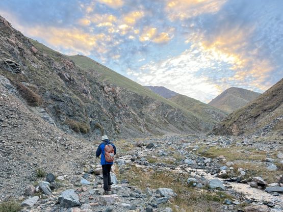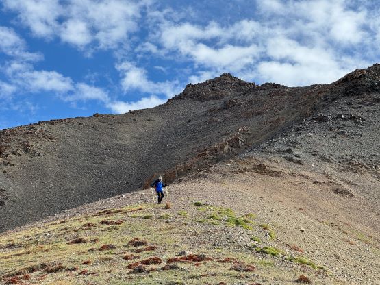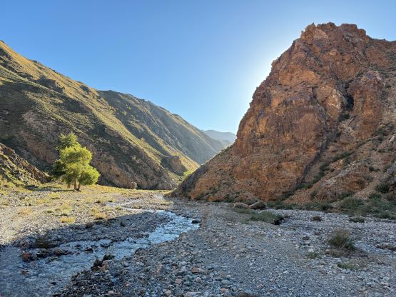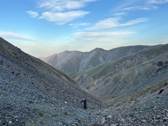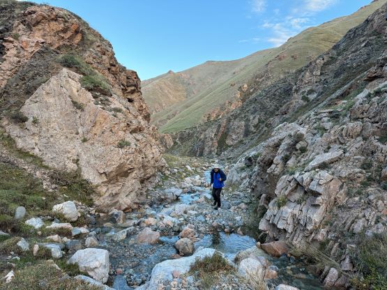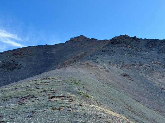 It was apparent that we no longer had enough daylight time to make the summit on this driving day so we waited until the next morning. The alarms were set at 5:50 am and the breakfast was served at 6 am. We eventually started walking without the need to use head-lamps, and Manlai this time opted to stay behind. We’d have another long day of driving ahead and it’s much better that he decided to sleep in for a few extra hours. It was only Petter and I that started this up and we essentially followed the exact same route that Rob and Deividas took. I’m someone who never takes other people’s route for granted and always look hard for other ideas using satellite images etc., but I failed to find a better route on this objective. The walking in the canyon bed was mostly pleasant and the running creek extended quite high up. I wondered where the running water came from as I don’t think this area sees a lot of precipitation.