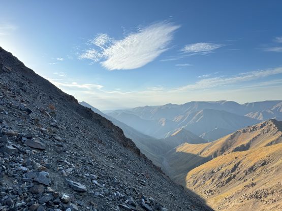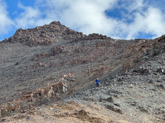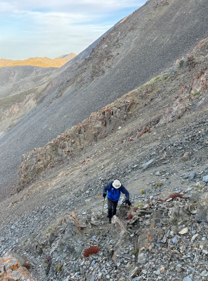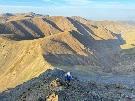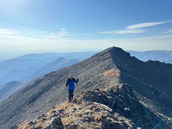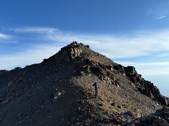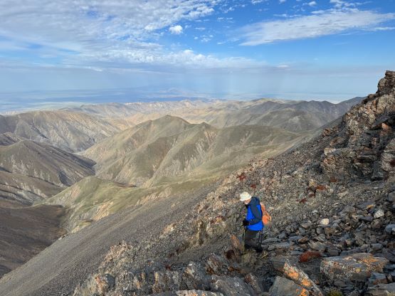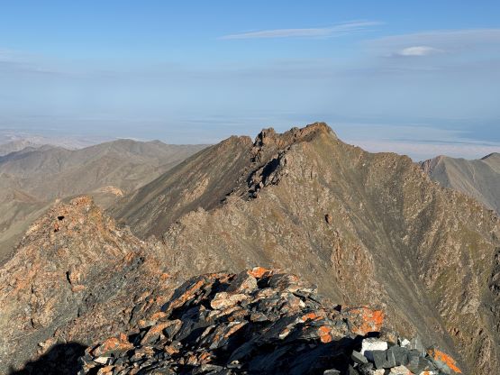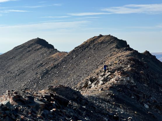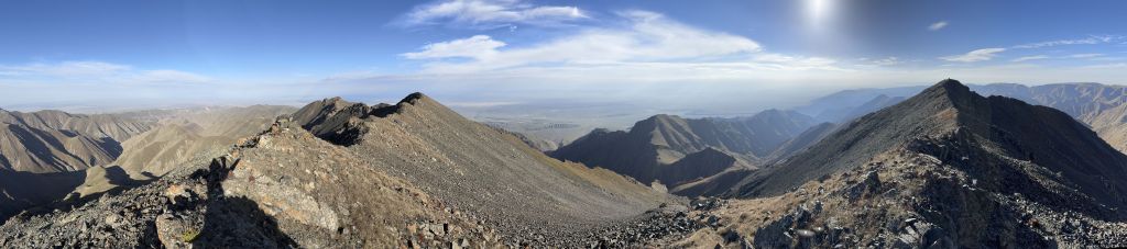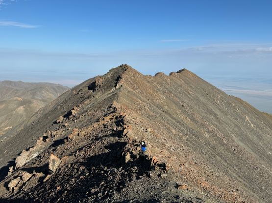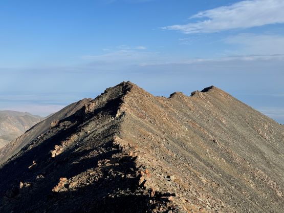 The canyon eventually terminated at the saddle south of the peak and the second half of this ascent would be a somewhat chossy scramble up the south ridge. The peak appeared chossy from afar and it sure was loose. Thankfully there wasn’t any particularly difficult section even though we did have to use our hands quite often. The “crux” section mentioned on Rob’s GPX track was some class 2 compact dirt but wasn’t difficult. There were a few harder moves that we did higher up by sticking on the ridge crest. Those could be bypassed on either side but such would require more traversing on compact choss. The summit ridge composes of three distinct high points. Rob and Deividas visited the first two but we tagged all three of them. The farthest one was definitely lower by at least 5 meters but the first two are roughly equal in elevation. Without a more thorough measurement the future parties would need to visit both summits to safely claim this objective. The ridge traverse was a pleasant walk with excellent views.