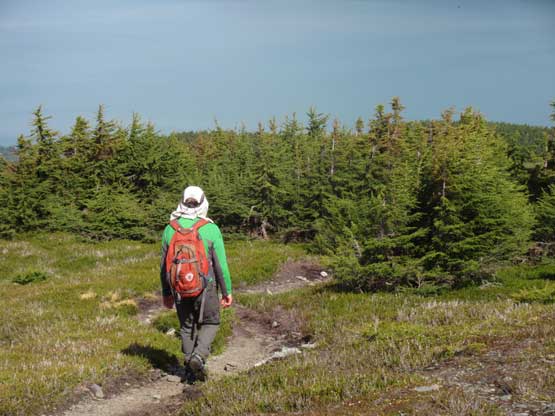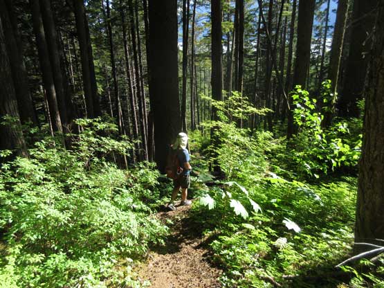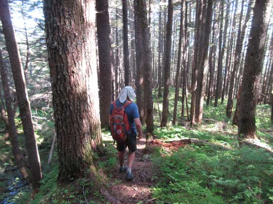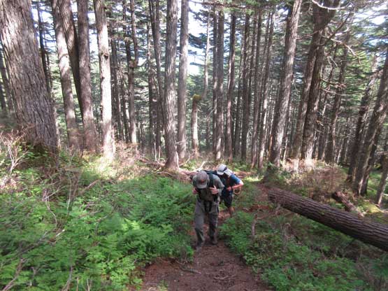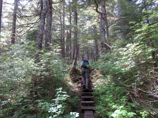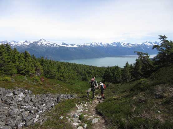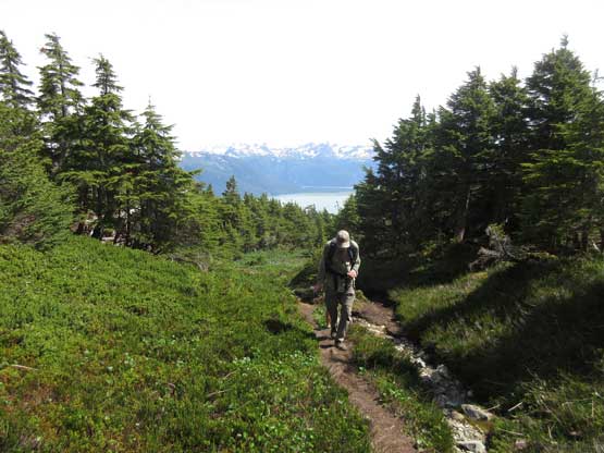 There are several trail-heads and we decided to head for the most popular one on the far east side of the mountain. Too bad we didn’t own a car in Haines and that added a couple extra kilometers into the hike. Eric and Greg proposed we might as well descend first to touch the water just so we could claim an ascent from sea level. Sounds fun. Why not… The rest of the road walk to the start of Skyline Trail was uneventful but very boring. The first few hundred meters of the ascent was also quite boring with nothing but trees to see. Because I left a lot of the gears in Drake’s hanger I had to find a tree branch as a trekking pole. I did find one and was happy about that.