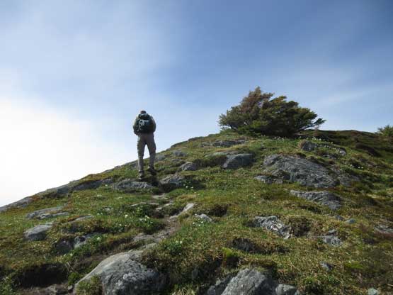 After what seemed like a long while we broke out of the forest and were treated by some incredible views of the rugged peaks and fjords. This was my first time hiking in Alaska and I was very excited to get higher and see more. There’s more ups than I was expecting including a few steep rolls that required some brief scrambling.