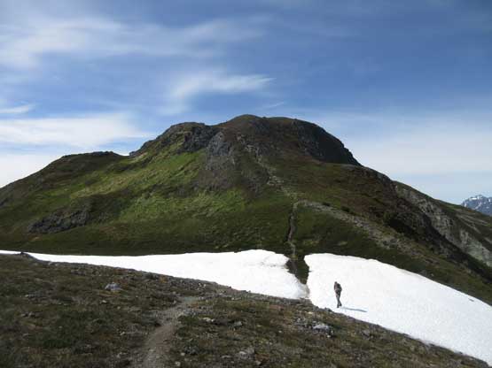 Eventually the terrain levels out but I was disappointed to see another bump down along the ridge that appeared higher. I didn’t bring my GPS to this trip but I’m sure the other summit is the true peak so we had to keep going. At least the traverse was scenic and we also found a patch of snow to fill up the water bottles. It was super duper hot and I thought we were hiking in Arizona instead of Alaska… We lingered a long while on the summit.