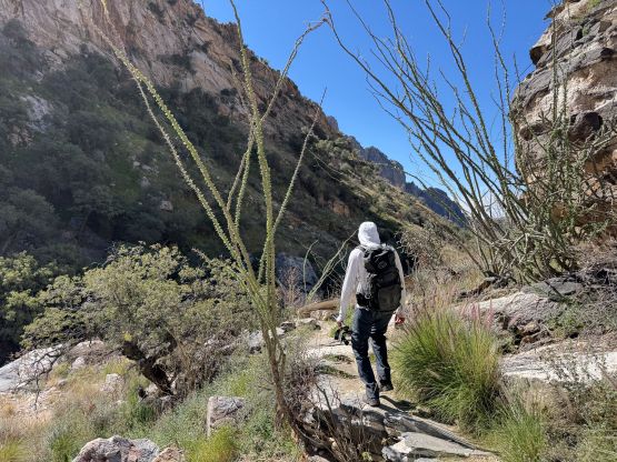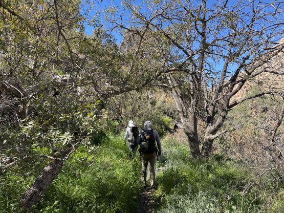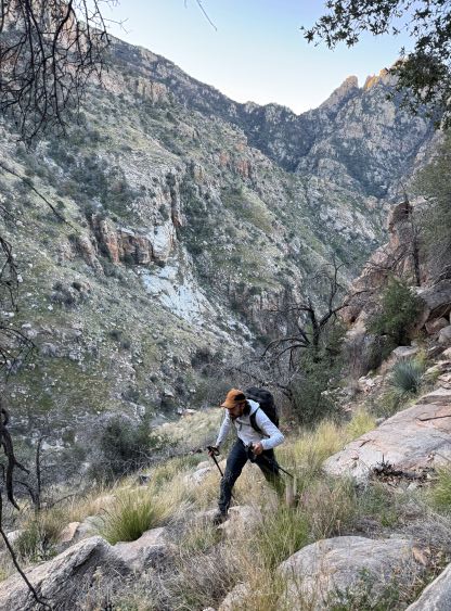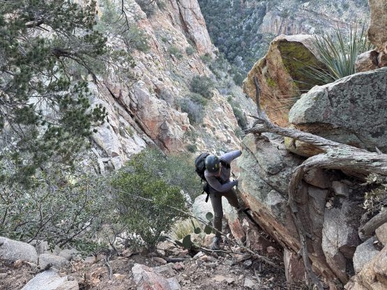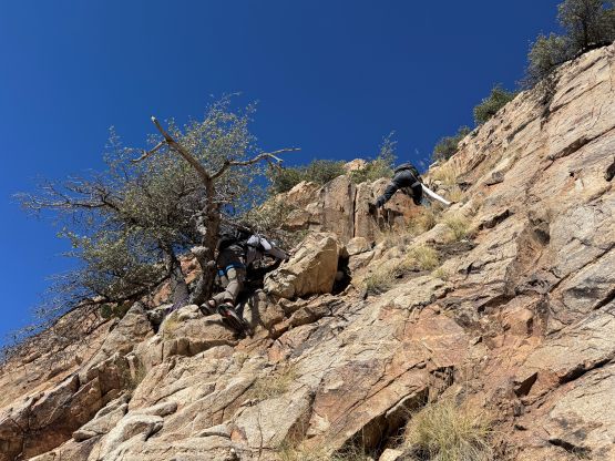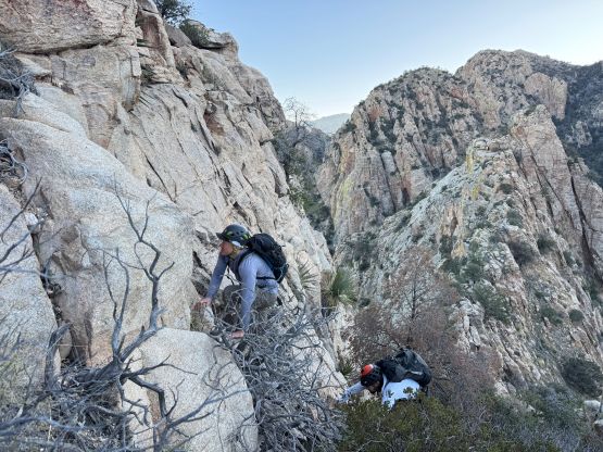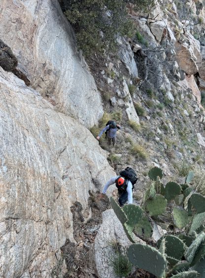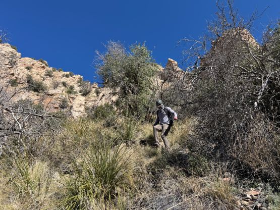 Kyle and Jesse’s phones were messed up by the time change which I thought was strange, as there’s actually no time change in the state of Arizona. They ended up waking up an hour earlier but my phone didn’t get messed up so I still needed some time for breakfast and packing. I was able to rush the morning routine through so we started a little bit earlier than planned. I opted to follow Jesse and Kyle up the trail approach so there’s little worth documenting. This is a long slog and they kept a good pace throughout. We did lose the trail a few times in the canyon but we were always able to find the trail after a little bit of backtracking. By the time we got to around 1400 m elevation underneath the objective the headlamps were finally turned off. Jesse’s idea was to attack the east ridge so we kept following the trail all the way to almost 1600 m elevation.