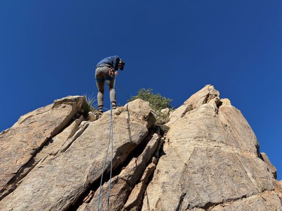 A 30m rope was more than sufficient for the rappel back down into the notch. I briefly went down northwards to check out the potential linking towards “Canine”, but with only one 30m rope I thought the descent would be too complicated. I then backtracked and we scrambled back up to the false summit. We spotted several rappel stations down the south face of the false summit so we went down that way, down-climbing past a few of them. The down-climb was more challenging than I thought but with careful route-finding I was able to find a way without having to pull the rope out. The down-climb past the final webbing was very tricky on chossy and down-sloping “holds”. The webbing got extended so it’s easier to just use that as a handline. There wasn’t a lot of bushwhacking to get back to the trail but the bushes were quite sticky so my pants got quite dirty.