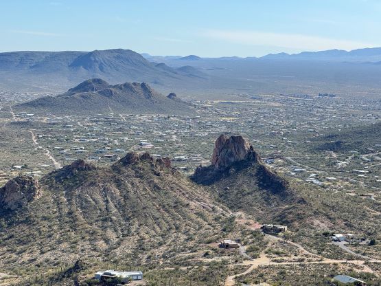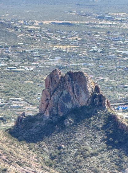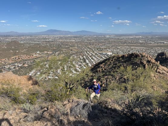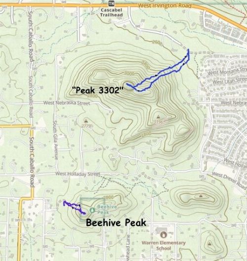These are some of the lesser summits in the urban areas SW of the city of Tucson but Beehive Peak is actually a rock tower that offers some mountaineering interest. The easiest route goes at 4th class via the west ridge but it’s very easy to get sucked into climbing terrain if one’s not careful with route-finding. The downside is the private property issue as these peaks are completely surrounded by private houses that I don’t think there’s a legal way of doing them without trespassing. But those who know me know that trespassing has never been a problem for me. In fact, I sometimes think that the requirement to trespass is what actually make some of the objectives attractive.
