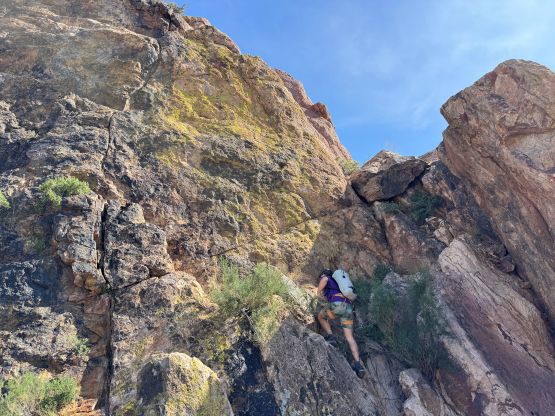 We found that electric cable “handline” and Caspar and Erica decided to cut it down. I sure wouldn’t rely on an electric cord if I were to pull myself up Jesse’s route. Caspar and Erica decided in situ to descend Jesse’s route with one rappel, whereas Matthias and I went down the west ridge retracing our steps. The main reason was to retrieve our ditched trekking poles at the start of the scramble. Otherwise I would have joined their rappel as well, as it seemed simpler given that we had brought ropes with us. The down-climb involved some dedicated moves. Both of us felt the worst was to down-climb that chossy groove as all of the “holds” were down-sloping and chossy. Despite the difficulties Matthias and I still got back to the vehicles quicker than Erica and Caspar, as our route was overall more direct.