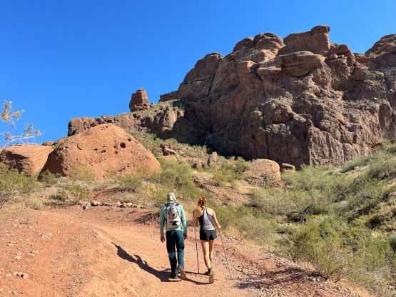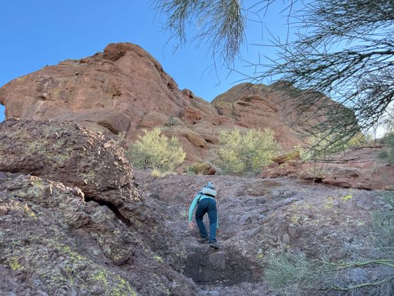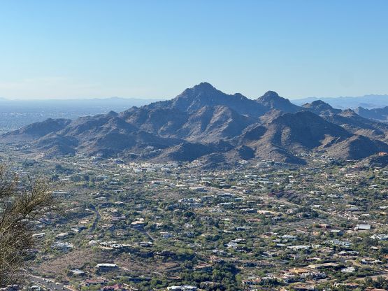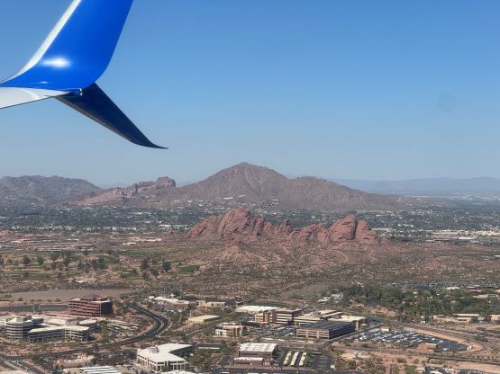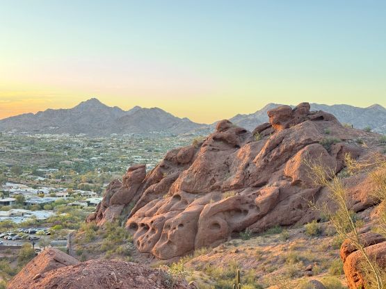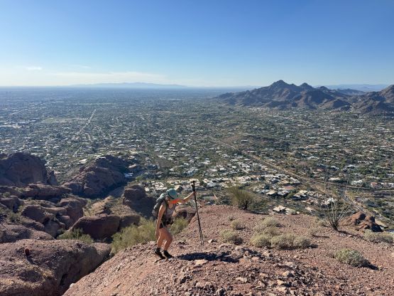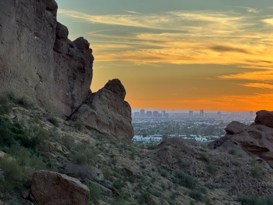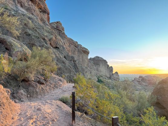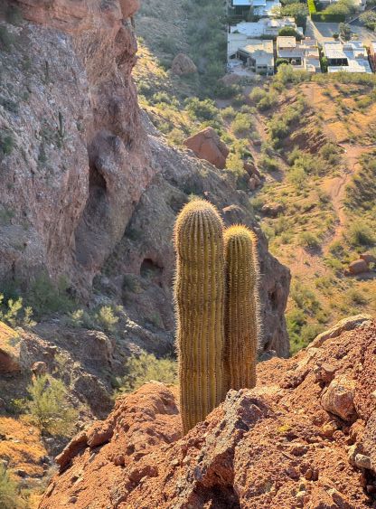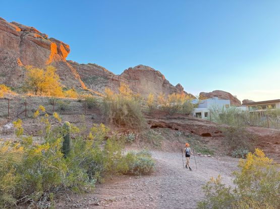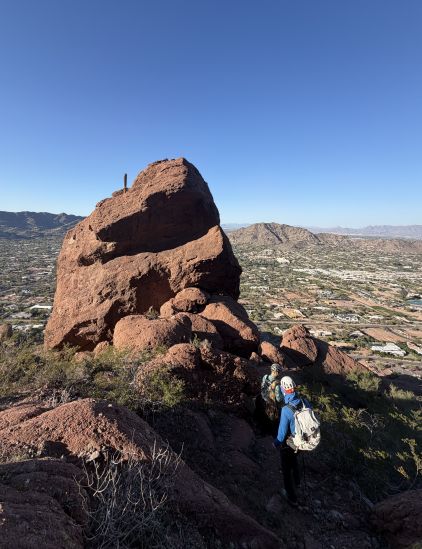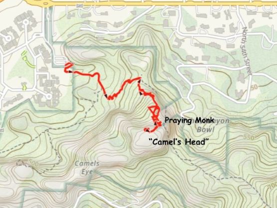 “Camel’s Head” is the unofficial name of the NW peak of Camelback Mtn. and boasts exactly 100 m prominence above the saddle between it and the main peak. I had hiked the main peak of Camelback Mtn. 9 years ago in the spring break. There’s no tourist’s way up the head that even the easiest route (Padrick’s Chimney) is rated 5.2 and I think it’s sandbagged. The Praying Monk is officially named, but is just a rock tower on the north slope of “Camel’s Head”. It’s a one-pitch climb rated at 5.6 so the tower boasts at most 20 m prominence (and hence not a ranked peak). I had been looking to do something short on the first day of this trip as my flight was supposed to arrive at 2:30 pm. The sunset would be at 6:30 pm so I thew out the suggestion to Caspar and Erica, and not to my surprise they were game. Erica was already in the area and Caspar’s flight would arrive 2 hours earlier than mine.