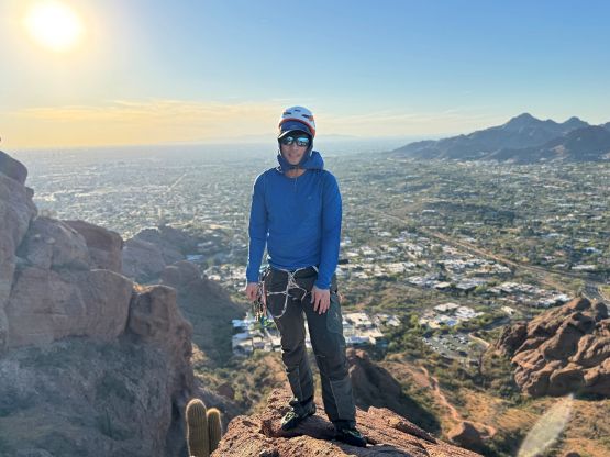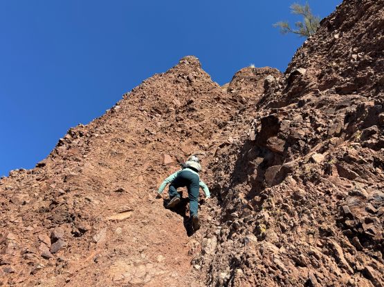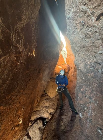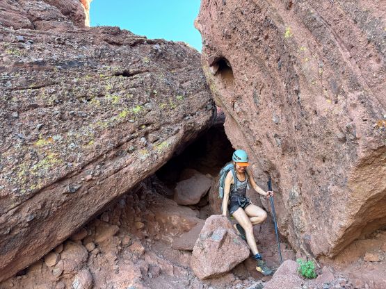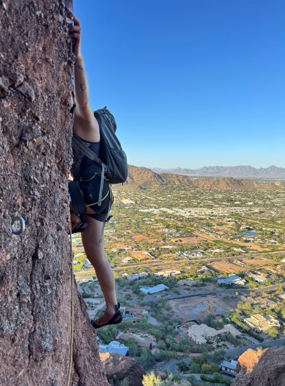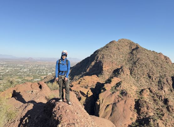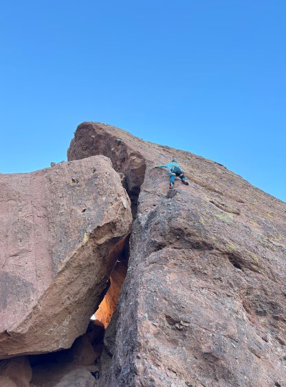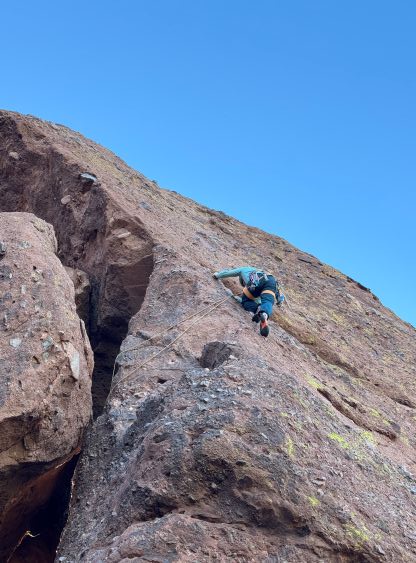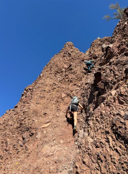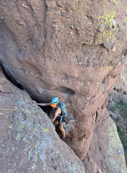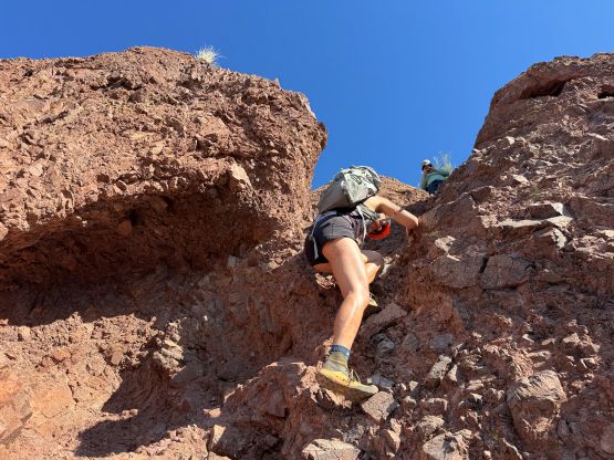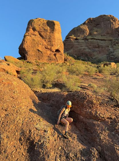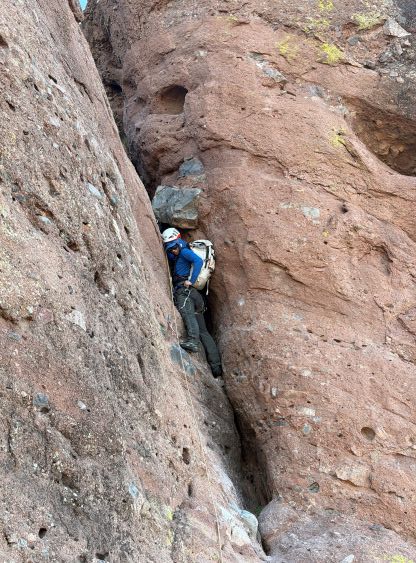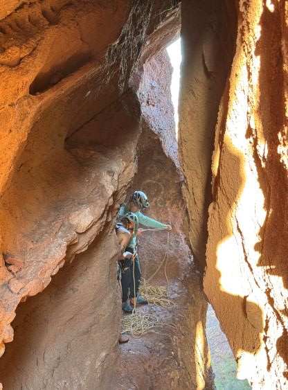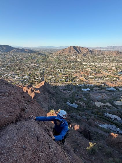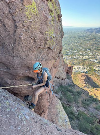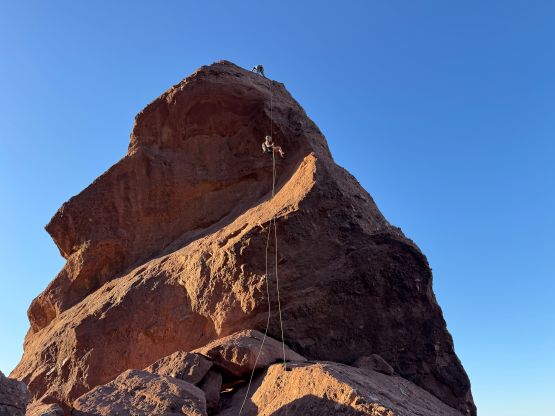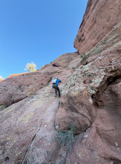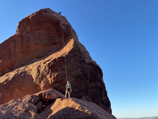 A short while later we scrambled back to the top of the chimney, and made a single rappel all the way down to the bottom of it. We then relocated ourselves to the base of the Praying Monk’s east face. There are two ways to start it up and we opted for the easier option through the cave feature onto a hidden ledge. It’s all scrambling up to that point. The pitch itself was definitely climbing and I felt the 5.6 grade was adequate. All of the moves were face climbing on conglomerate or what I would call the chocolates sticking out of the cookie, but believe it or not the rock quality was actually quite solid. We also bumped into Aaron Collins who’s the founder of “Arizona Mountain Guides” which I followed on Instagram. I thought that was quite cool. Aaron was leading his girlfriend up behind us. The three of us then made an overhanging rappel using the 60m rope down the north side of the tower.