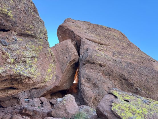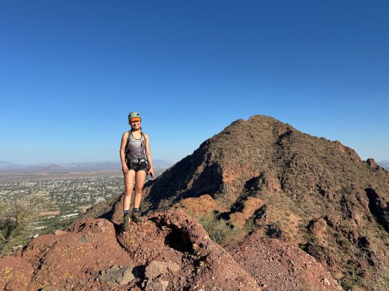 We then wrapped around the NE side of The Praying Monk underneath the east face’s climbing route. There’s some unofficial trails leading to the base of the Padrick’s Chimney. Again, the pitch appeared much harder than 5.2 so we decided to properly pitch it out. We all soloed the lower half to directly underneath the chimney, and even this section felt trickier than expected thank to the down-sloping nature and the lack of holds. Caspar essentially soloed the chimney while trailing the rope up, and Erica and I followed afterwards. We all got up through the crux bulge in different ways. The moves I did were nowhere near the 5.2 range but maybe that’s just because I’m not used to the chimneys nor the desert rock formation. In any case there’s no way for us to down-climb this pitch so we left the rope fixed for the rappel, and resumed the scramble to the summit. There’s some route-finding involved but the route was mostly straightforward. There’s actually a cool arch feature on the very top of this peak.