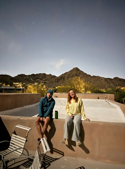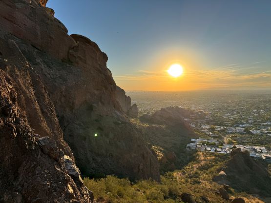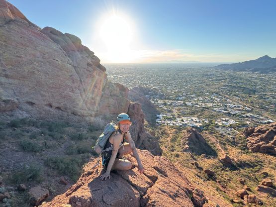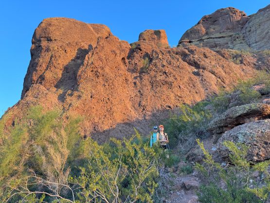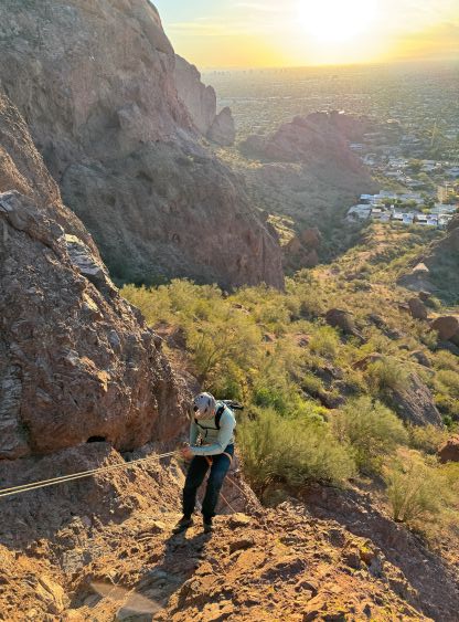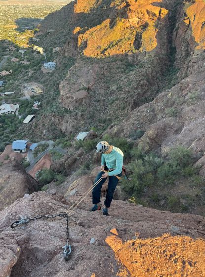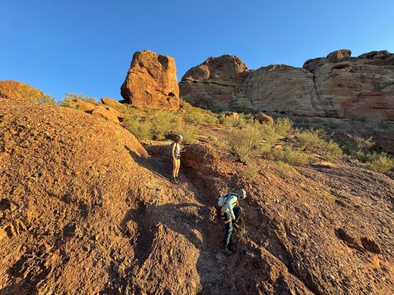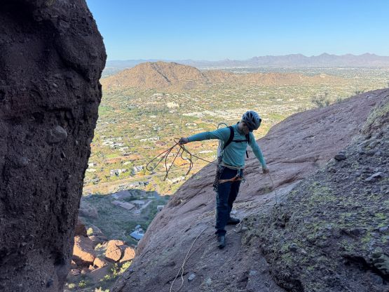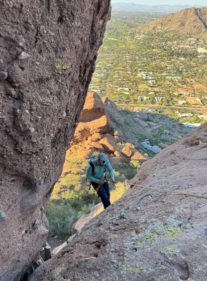 It seems like we definitely wouldn’t need the headlamps but we still wanted to hurry up. It was a bit difficult to locate the “approach pitch” from above, but after some messing around we found an eye-bolt anchor and made a rappel down the lower wall. We didn’t rappel the exact same way that we had come up from, but that’s okay. We then leisurely walked back to the vehicle and then drove to Caspar’s uncle’s place in Paradise Valley underneath Mummy Mtn.