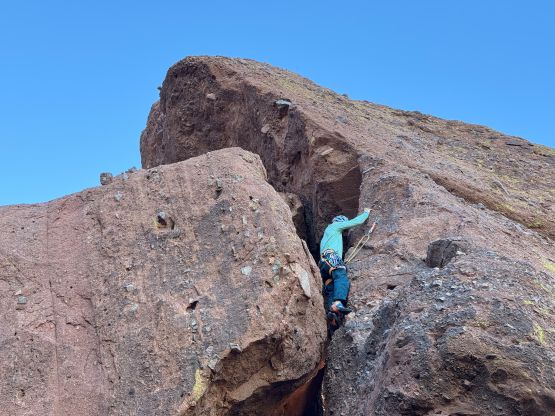 The approach was as short as we could possibly imagine. As someone living in the NW I thought this was absurd. In less than a kilometer and just over 100 m elevation gain we were at the base of the “approach pitch”. The easiest way up the lower headwall underneath The Praying Monk is rated “4th class” and is advertised as “the walk up”. I thought this was nowhere a walk-up, but is indeed easier than any other alternative. The rock formation is mostly volcanic conglomerate but due to the amount of traffics the rock quality was way better than appeared. We hardly encountered any loose rock on this long pitch of 4th class. The climbing was quite sustained and definitely exposed, so most “scramblers” would want a belay on this pitch except for the most competent. We all soloed it without a problem.
