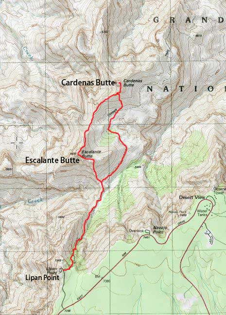 Cardenas Butte is one of those rugged buttes below the south rim of Grand Canyon in the far eastern side of the national park. Those buttes have been gazed by hundreds of thousands of people every year from the observation tower at Desert View, and yet, only the selected peak-baggers would bother to research their names. Cardenas Butte is probably one of the easiest summits in Grand Canyon with the easiest route rated at a mere Class 2 scramble, along with a well-maintained trail (Tanner Trail) for access. For the more adventurous folks it also makes a fun scramble traverse when combining with the nearby Escalante Butte, and that’s exactly what I did.