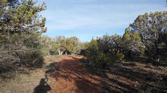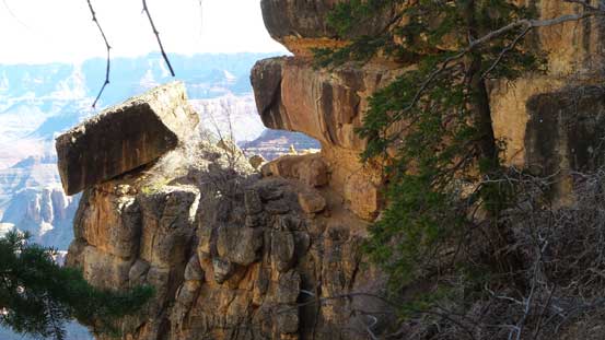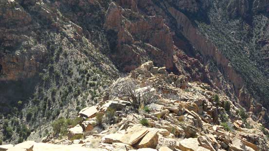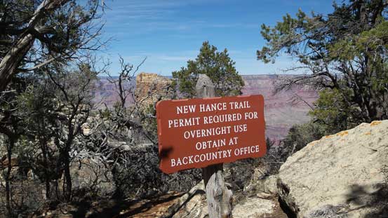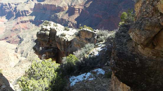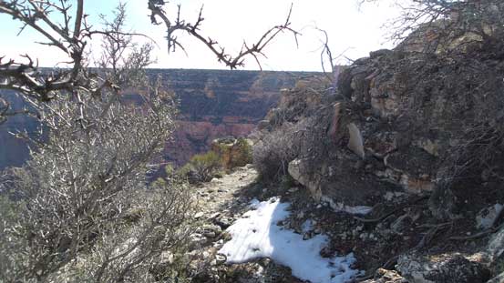 I did not bother to watch sunrise on this day. I slept in till pretty much whenever I wanted, had some breakfast in the small town of Tusayan and then drove northwards into the park. There were already three cars parked in those aforementioned pull-outs but I did manage to get a spot. After gearing up I walked backwards (towards west) for about 500 meters and then correctly located the trail-head, with some very clear signs saying “you cannot park here”. I had no idea why they wanted people to stay off this trail but I did not see any sign of “no hiking”, so into the woods I went. A short stretch of dirt roads led me to the proper trail-head and here it’s becoming more “official” again with maps, registrations and so on. Just like the previous two days I encountered ice on the very upper reach of New Hance Trail but they did not impose much of a problem. This trail was also considerably steeper and rougher comparing to the Bright Angel but for someone coming from Vancouver coast I would not call this “steep” nor “rough”, not even close.. 400 vertical meters down into the canyon I left the trail and headed for the saddle.