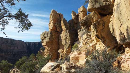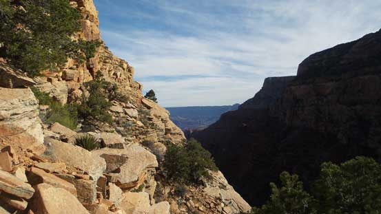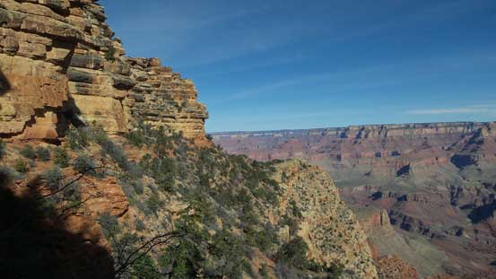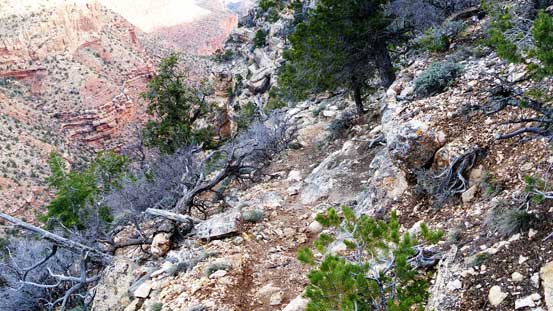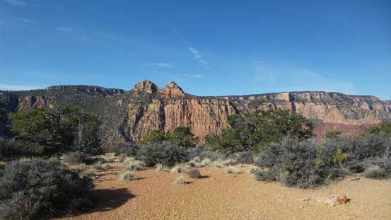 I did not bother to watch sunrise on this day. I slept in till pretty much whenever I wanted, had some breakfast in the small town of Tusayan and then drove northwards into the park. There were already three cars parked in those aforementioned pull-outs but I did manage to get a spot. After gearing up I walked backwards (towards west) for about 500 meters and then correctly located the trail-head, with some very clear signs saying “you cannot park here”. I had no idea why they wanted people to stay off this trail but I did not see any sign of “no hiking”, so into the woods I went. A short stretch of dirt roads led me to the proper trail-head and here it’s becoming more “official” again with maps, registrations and so on. Just like the previous two days I encountered ice on the very upper reach of New Hance Trail but they did not impose much of a problem. This trail was also considerably steeper and rougher comparing to the Bright Angel but for someone coming from Vancouver coast I would not call this “steep” nor “rough”, not even close.. 400 vertical meters down into the canyon I left the trail and headed for the saddle.