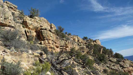 Upwards from the saddle the route was initially very obvious – just follow the spine of the ridge up. It’s mostly a class-1 or 2 trudge with occasional use of hands for balance as there’re plenty of boulders around. The first obstacle came near the “middle bench plateau”. Just below the plateau there’s a cliff band which I must skirt around on climber’s right side for quite a ways to find a break. The gully that breaks this band has a very characteristic tree in the middle and I spotted it instantaneously upon arriving. The traverse of the “middle bench/plateau” was nice and scenic but then looking ahead the summit fortress was pretty intimidating.