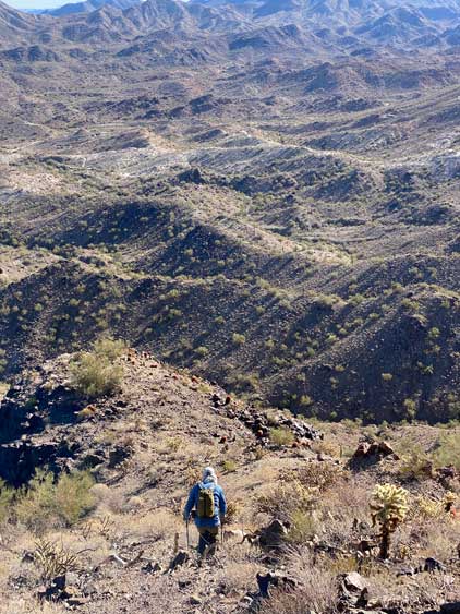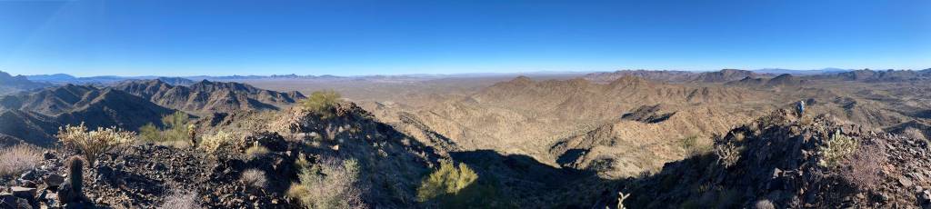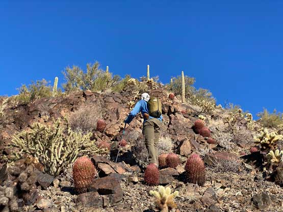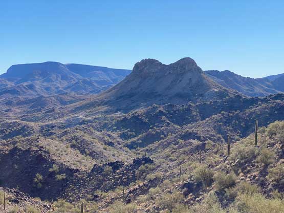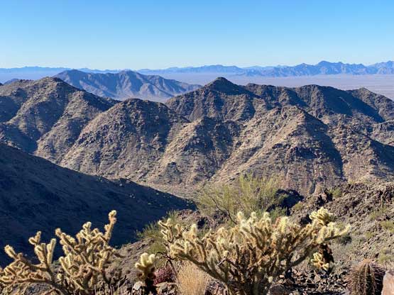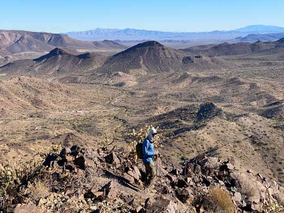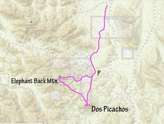 My original plan was to stay more-or-less on the connecting ridge but that involved at least two or three minor bumps. We descended too far off Dos Picachos’ north slope and from our current position the better option was to descend even further to link up several washes. Adam led most of the way since I had very little motivation about this add-on summit. To link up those washes we had to scramble up and over a few ridges with a lot of side-hilling. Upwards again the terrain on the south slopes of Elephant Back Mountain felt like those loose, volcanic type of choss covered in chollas and other types of thorny plants. Wearing trail-runners started to seem like a non-ideal decision but we also wouldn’t want to carry boots for such a lame objective. Thankfully the slog to the summit was not a notably long one.