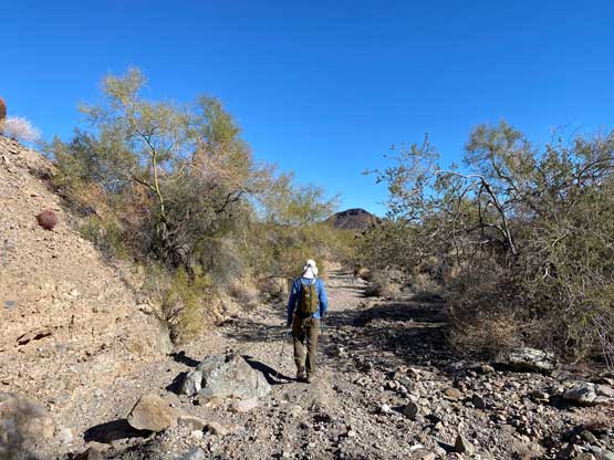 Elephant Back Mountain is one of those small, but officially-named summits that does not boast any mountaineering interest. The peak might appear innocent, but covered in chollas and choss. In fact, this was probably the worst peak that Adam and I tagged in this Christmas-New Year trip. Earlier in the day we had scrambled Dos Picachos based of “no beta”. We were quite satisfied but the day was still young and we noticed the name “Elephant Back Mountain” on the maps. We figured that to add this summit into the day wouldn’t cost more than 2 extra hours. The decision was made to make a direct dash from the bottom of Dos Picachos towards Elephant Back Mountain.