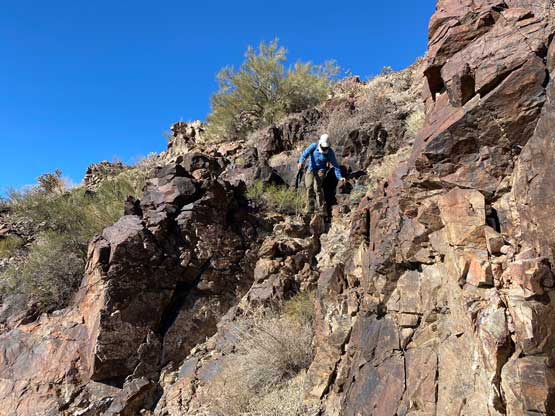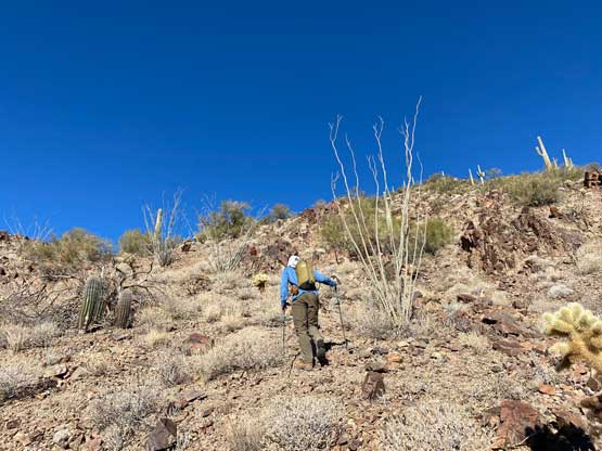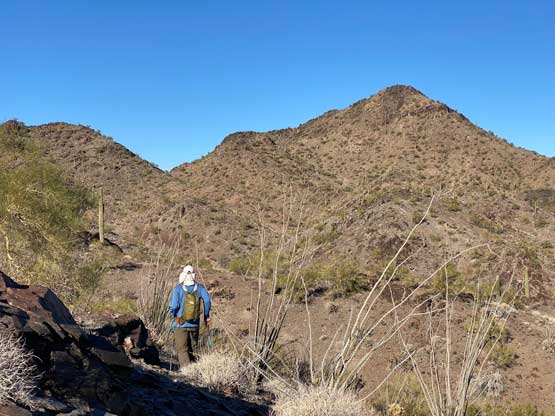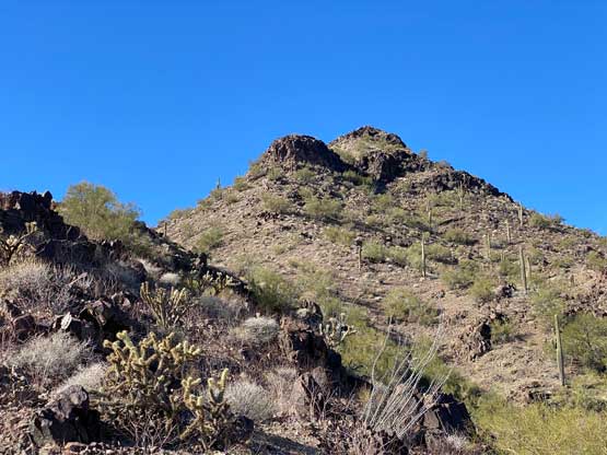 My original plan was to stay more-or-less on the connecting ridge but that involved at least two or three minor bumps. We descended too far off Dos Picachos’ north slope and from our current position the better option was to descend even further to link up several washes. Adam led most of the way since I had very little motivation about this add-on summit. To link up those washes we had to scramble up and over a few ridges with a lot of side-hilling. Upwards again the terrain on the south slopes of Elephant Back Mountain felt like those loose, volcanic type of choss covered in chollas and other types of thorny plants. Wearing trail-runners started to seem like a non-ideal decision but we also wouldn’t want to carry boots for such a lame objective. Thankfully the slog to the summit was not a notably long one.