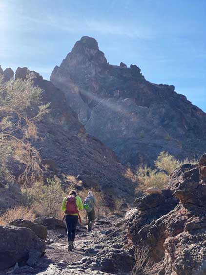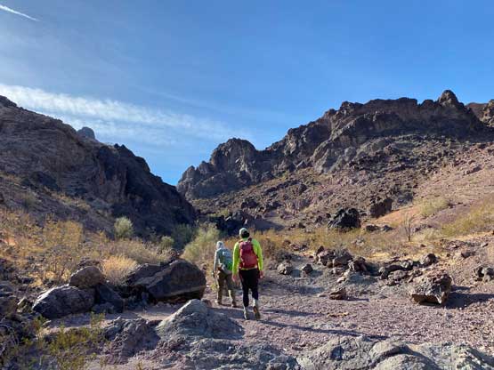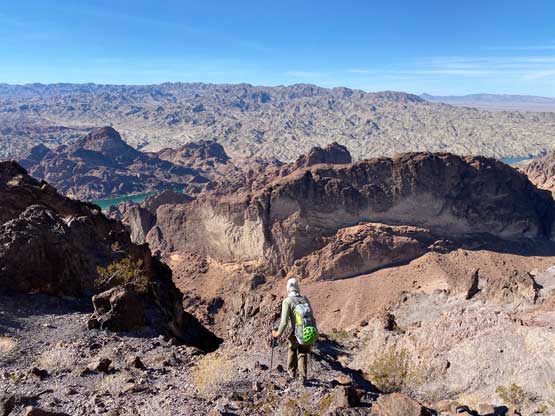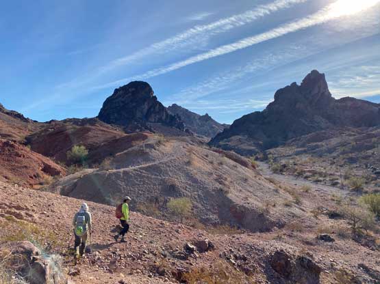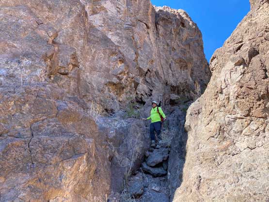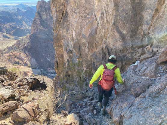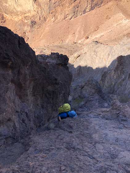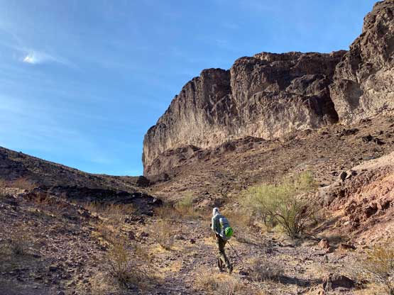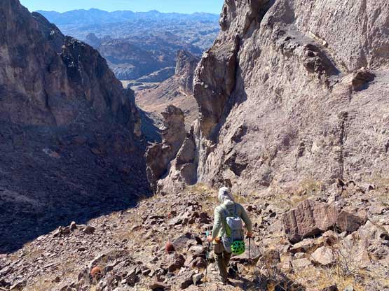 This was one group of peaks that I had done absolutely no research whatsoever and I fully relied on Adam and Sean’s lead as they had read Stav Basis and some others’ trip reports. Unfortunately none of those trip reports came with a GPX file. In the end we likely have put up a new technical route on “South Dome” as well as an infrequently ascended, if not new route on “Gold Dome”. Our route-finding errors eventually turned out to be “good things” that made this trip extremely memorable and satisfying but that usually would not be the case. The approach to the pass between “Gold Dome” and “Havasuper Peak” was long, arduous and confusing at times. Again, I just followed Adam and Sean’s lead plodding into and out of one wash after another. The micro-terrain’s up-and-downs had accumulated to at least 100 m and we weren’t even getting any closer. We switched from one wash to another and even scrambled through some canyons, but eventually we found the old roads that led to the Gold Dome mine at Gold Dome/Havasuper pass. Looking at our own GPX track from home I’m not confident that we had taken the most efficient path, but any route would involve micro-terrain and I’m certain about that.