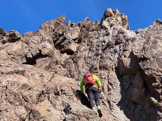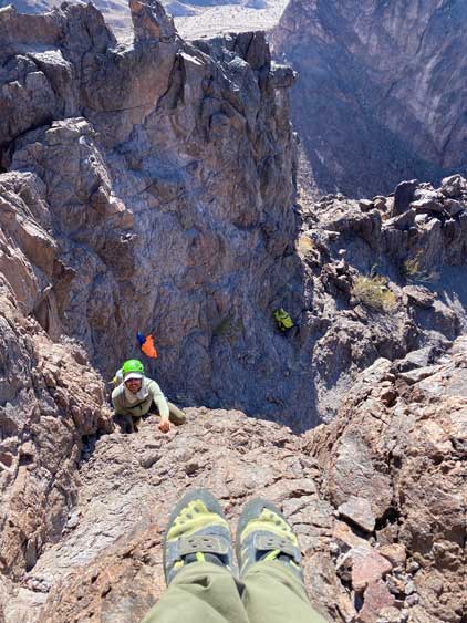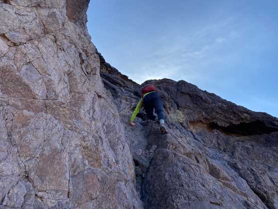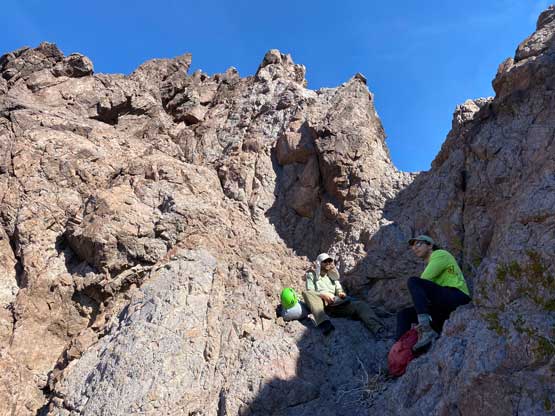 Sean and I made a spontaneous decision to explore a route up the west face of Gold Dome partly because we were tired of traversing and the up-and-downs. Adam didn’t want to take a chance on the success so he kept traversing to the south gully, the “standard route” on this peak. I normally would stick to the easiest route but I had no idea what to expect on the south side since I did zero research. The west face started off mostly class 3 but we soon encountered a series of class 4 steps that would be difficult to down-climb, if needed. The scrambling was mostly enjoyable such that we didn’t pay attention to a deep chasm on the left side. Sean and I eventually topped out on a pinnacle on the south ridge with a vertical, if not overhanging drop to join Adam’s route. Adam had already made to that same spot, but on the correct side of this pinnacle waving at us. One rappel would resolve the problem, but the rope was in Adam’s pack. The only option for Sean and I now was to descend the face until finding a reasonable spot to down-climb into that chasm, which turned out to be about halfway down the face. We started to re-climb immediately right next to the shear wall and faced another tricky section. Sean soloed a pitch of 4th class conglomerate that I did not feel comfortable with. I ended up backtracking at least 50 meters before finding an easier alternative. I eventually joined the rest of the team on the correct spot on the south ridge. The route ahead appeared steep and difficult so I donned harness and rock shoes.