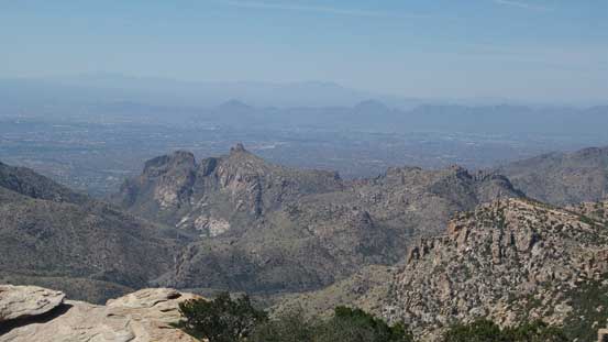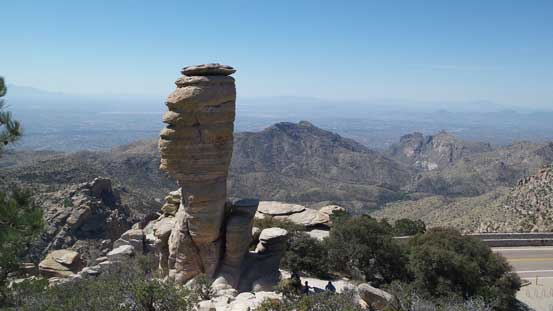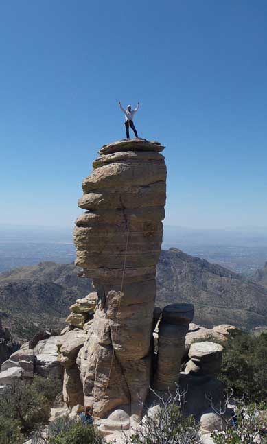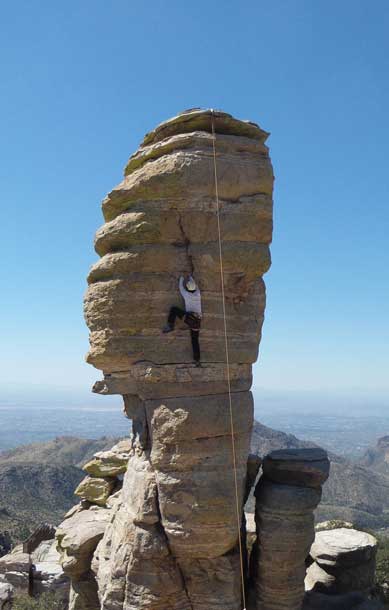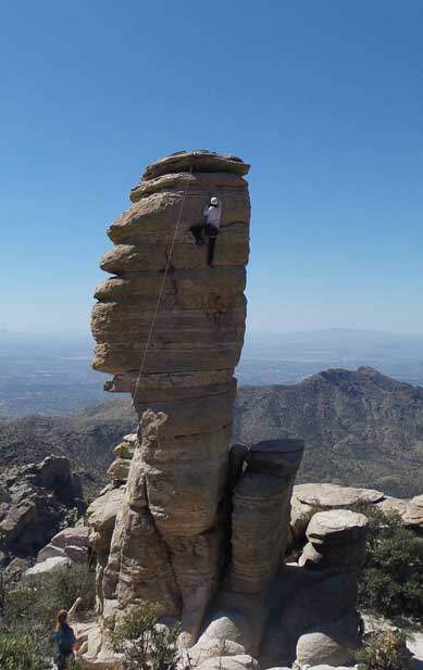Hitchcock Pinnacle is by no doubt the most popular rock climb near Mt. Lemmon north of the city of Tucson. The access is by Santa Catalina Highway (aka. Mt. Lemmon Highway) and the photogenic pinnacle is right beside a roadside tourism area called “Windy Point”. There are a couple routes ranging from 5.7 to 5.10 although most come up from the north side 5.7 route which is exactly the one I climbed. For obvious reasons this was not on my plan as I came down to Arizona by myself but I did bring the climbing gears. At the parking lot I met two climbers from Chicago and then they kindly offered me a belay up this spire.