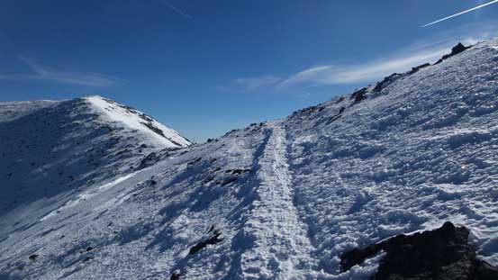 It had become apparent that I no longer needed snowshoes on this day so at somewhere near Agassiz/Humphreys col I ditched them behind a pretty “hidden” rock outcrop. The initial stretch ascending out of Agassiz/Humphreys col was the steepest on this route but even so, there’s nothing worth noting. There were plenty of tracks and footsteps and the snow was in the perfect conditions. Higher up the terrain became rockier and then the ridge did a transition from N-S orientation to NE-SW. A few minor up-and-downs soon followed and than that cold wind picked up again, but the traverse was super scenic so there’s nothing to complain about.