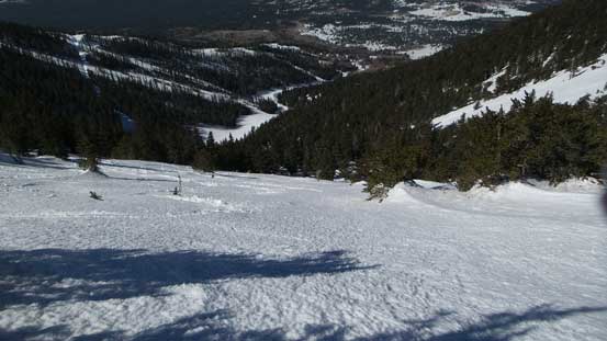After taking another long break at the col it’s finally the time to head down. I did not bother to follow the trail nor the aforementioned “winter route”, and instead I just took a direct beeline down the drainage and into the resort runs, and then easily boot-packed back to the parking lot.