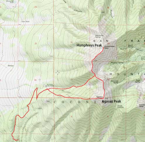 Ascent route for Agassiz Peak and Humphreys Peak. GPX DL