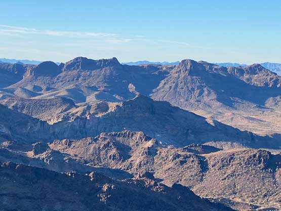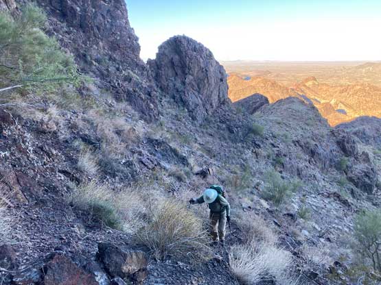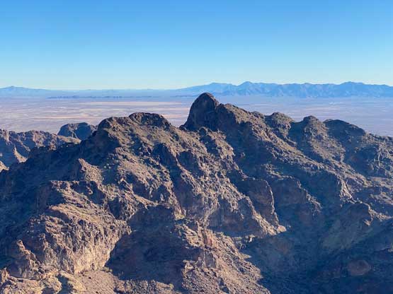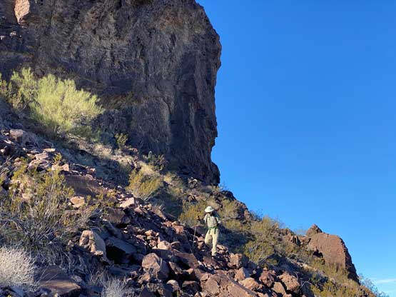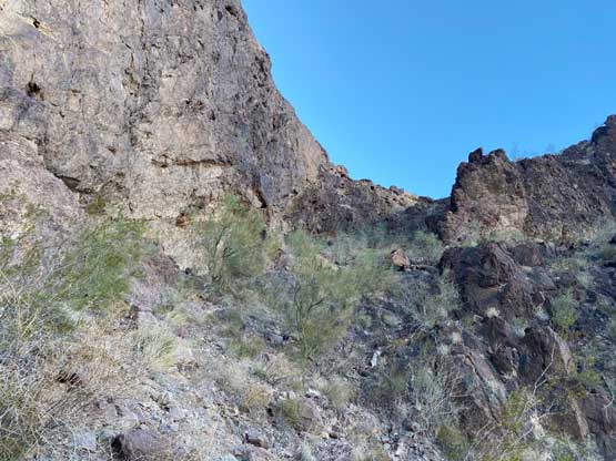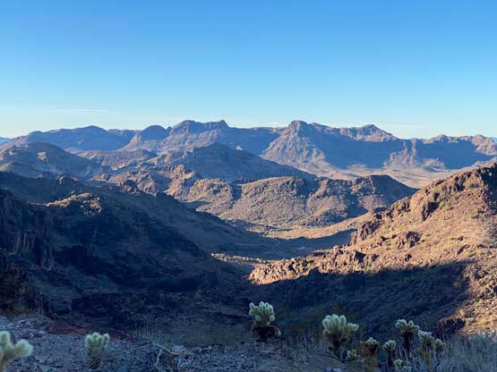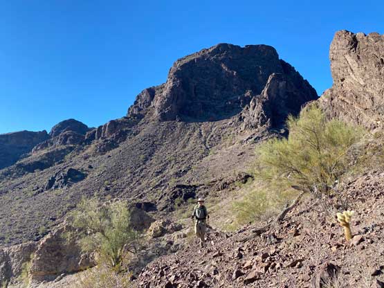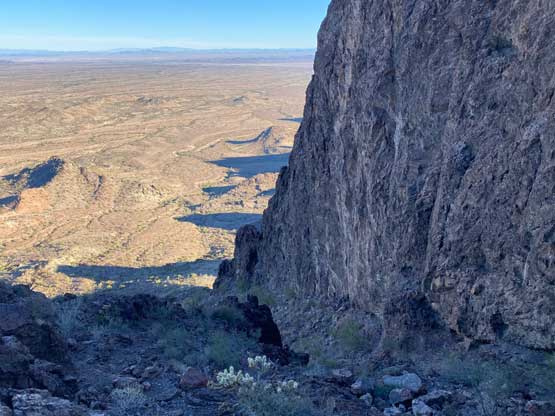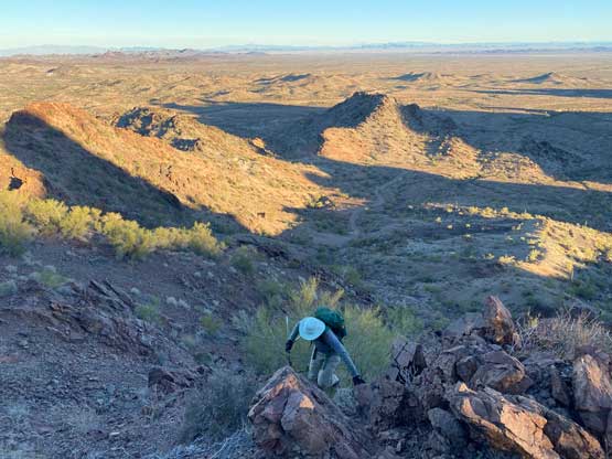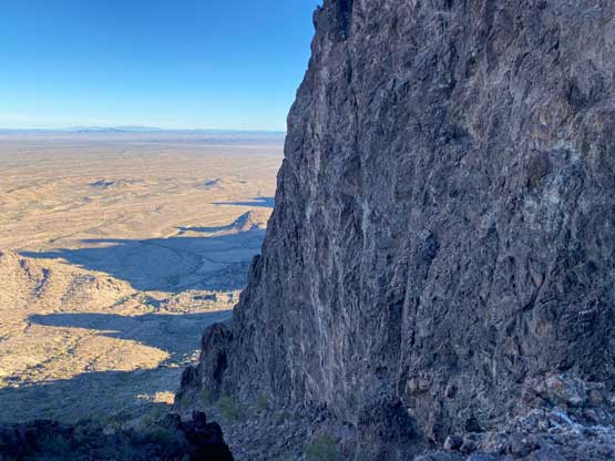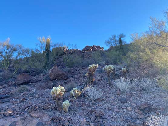 The ramp itself turned out to be quite tame with maybe 2 or 3 moves that could be called “class 3”. Had we looked harder for the easiest path this scramble could stay entirely within “class 2”. We ditched our backpacks above the ramp since we would definitely go back via the same route. The upper west slopes seemed like a slog and the summit felt anticlimactic as it’s rather just a broad plateau. We also had to pay close attention to not get stabbed by chollas on this upper west slopes. This summit “plateau” is rather just another cholla garden.
