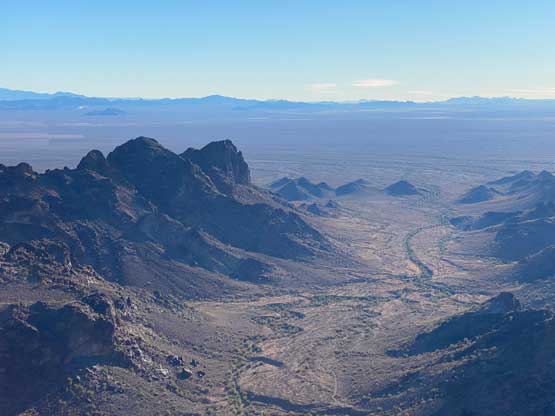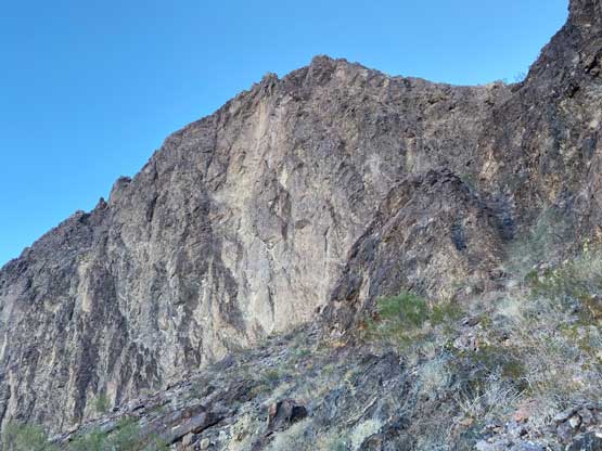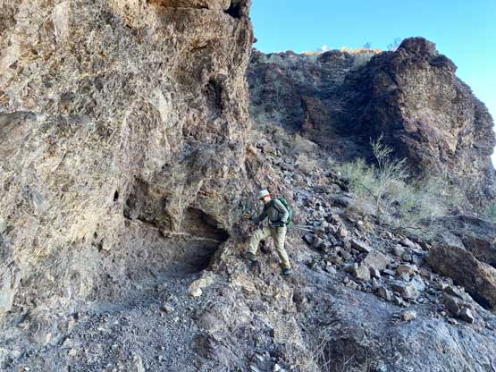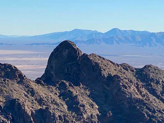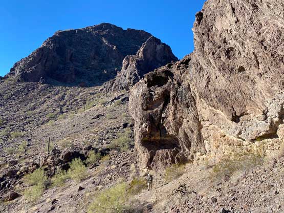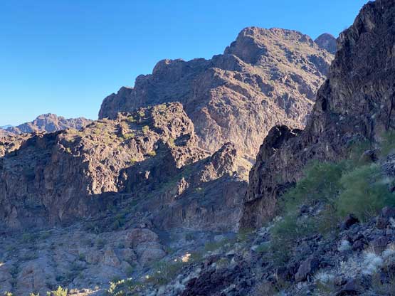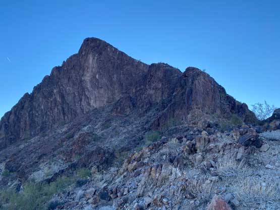 Adam’s primary objective was Haystack Peak which is only marginally lower than Ibex Peak but is considerably more difficult. Adam had tried that peak in the past but couldn’t make the summit. Matthias decided at the last minute to join us for this twofer outing with his trusty 4Runner with some of the most aggressive off-road tires I’ve seen. With that vehicle we would have no problem making to the driveable end to not make this day any longer than needed. Adam and I car-camped on a spot on Plomosa Road that clearly had a sign of “No Camping”, but we plainly ignored it. It was already dark by the time we parked at that spot, so the chance of getting caught and fined was next to zero. Indeed, nobody came around to fuss with us overnight and Matthias showed up at daybreak. We left Adam’s Subaru on that spot. The roads were all correctly marked on my Gaia’s map but there seemed to have too many spur roads to confuse us. I had also downloaded the satellite images so with the two map layers we had no problem navigating to the road’s end. We only had to do one minor backtrack and that’s mostly because I failed to pay attention. The last 500 m was extremely rough even for Matthias’ 4Runner but with some determination we still made there.