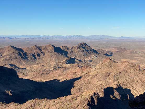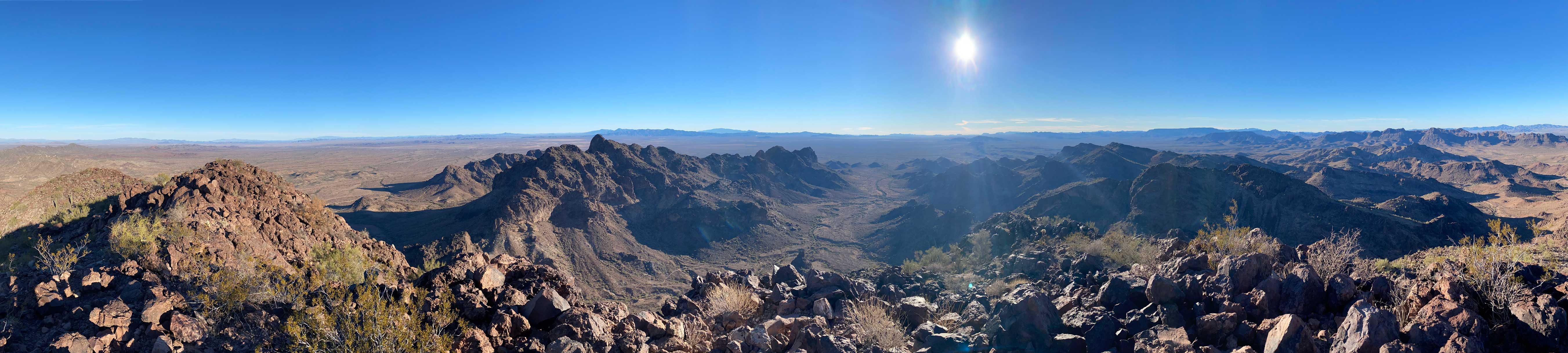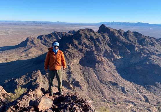 Ibex Peak is an iconic pyramid that boasts over 300m/1000ft prominence a few dozen kilometers to the NE of Quartzsite. This area is not known for climbing or mountainous activities so this peak is still largely unknown to most, except for the locals. The standard route is mostly “class 2” with a short approach, but the crux is the drive-in, as the mining roads off Plomosa Road do require a 4×4, high clearance vehicle. Adam had previously driven his Subaru to near the end of the road but he was not keen to do that again. Knowing how much Adam pushes his vehicle I would expect this access to be fully truck/Jeep/ATV country for the averaged drivers.