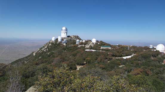 I did this as a side trip on top of the long drive from Phoenix, AZ to El Paso, TX and earlier in the morning I had just completed a scramble up a roadside classic – Picacho Peak. I had the afternoon ahead of schedule but given the hotness I was not interested in anything outrageous. There is a paved road to pretty much the summit of Kitt Peak so I wasn’t going to fancy anything about it and a drive to the top and that’s it. The true summit would involve a few scrambling moves on granite boulders but that’s just a short detour from the upper parking lot.
