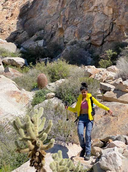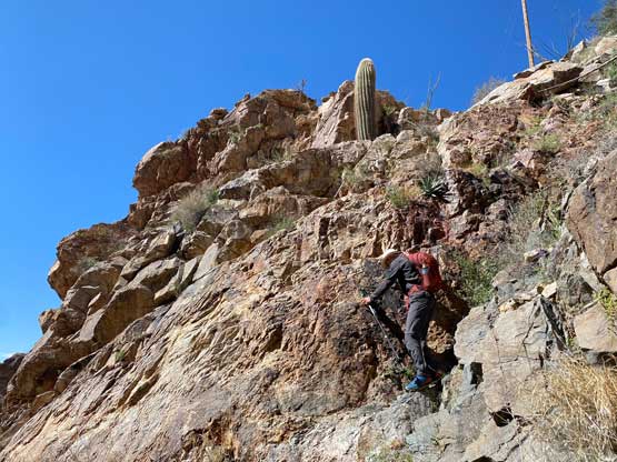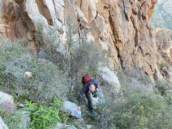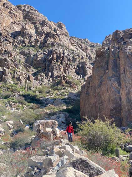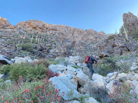We took a more direct, but lesser defined road to the start of the climber’s “trail” which was on the east side of a canal. This road would not be suitable for any vehicle even if the puddle of mud wasn’t there at the start. There’s a foot bridge crossing the canal and then we picked up some cairns here and there. The path was difficult to follow as a trail, but with the GPX tracks, the cairns and our general sense of direction it wasn’t difficult to stay on track. There was more boulder-hopping and bushwhacking than anticipated and most of the bushes here are the thorny cacti.