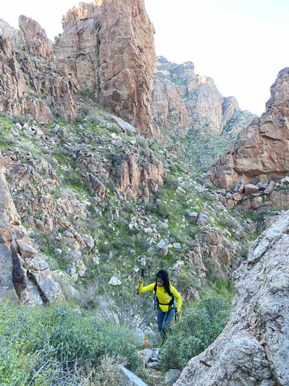 We took a more direct, but lesser defined road to the start of the climber’s “trail” which was on the east side of a canal. This road would not be suitable for any vehicle even if the puddle of mud wasn’t there at the start. There’s a foot bridge crossing the canal and then we picked up some cairns here and there. The path was difficult to follow as a trail, but with the GPX tracks, the cairns and our general sense of direction it wasn’t difficult to stay on track. There was more boulder-hopping and bushwhacking than anticipated and most of the bushes here are the thorny cacti.