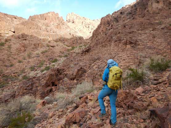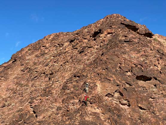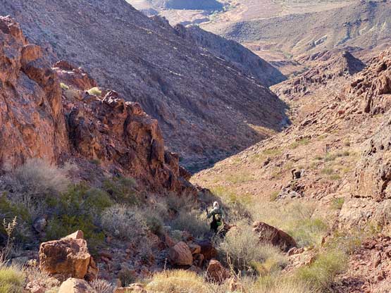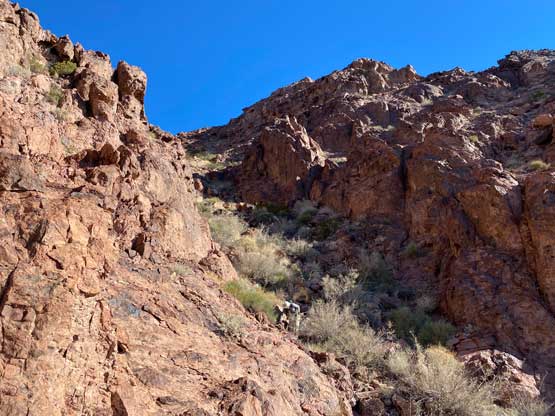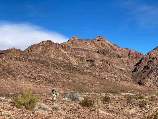 The general consensus was to use the south slopes that consists of several gullies and ribs to ascend, but to get there we must do about 1 mile of cross country travel on the desert floor with some undulating micro-terrain. In terms of the bigger picture it really didn’t matter where exactly to go, as long as the general bearing was correct. We opted to link up several washes and plodded up and over a few smaller passes before plodding onto the lower south slopes. The exact route we took on the scramble was quite different than what I had pictured from just gazing at the maps, as the actual terrain looked to be a lot less intimidating. We decided to just ascend uphill and decide one step at a time.
