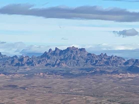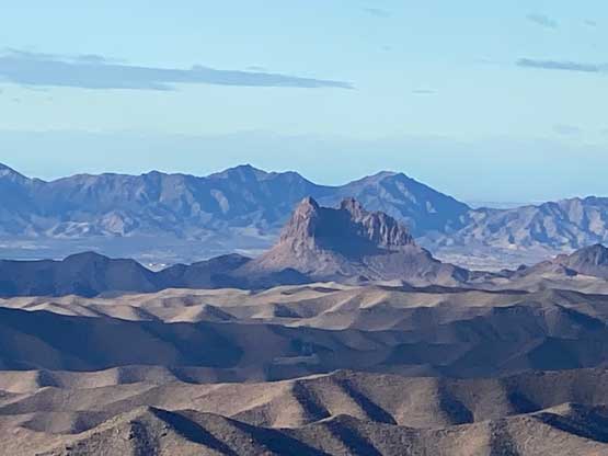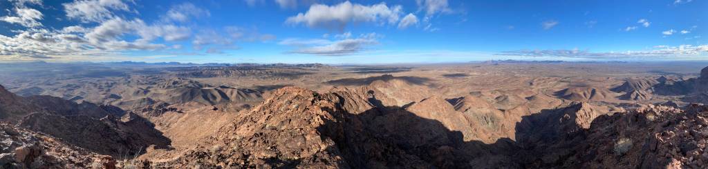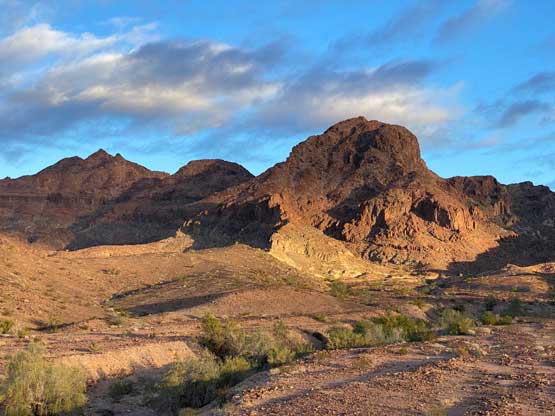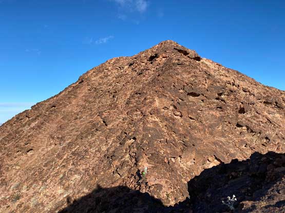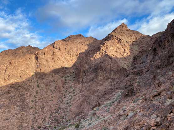 We talked about to descend a different route to close in a loop, but we couldn’t see the entire picture and the last thing we wanted was to get cliffed out. The decision was then made to retrace the same route despite that annoying 50-m side-hilling re-ascent. The descent of that gully was also not quite pleasant with some loose terrain and we also missed the easiest line down through that dry-fall and down-climbed some harder 3rd class steps. The rest of the return was uneventful and the entire hike turned out to be much shorter than anticipated. Given the time of the day we made the new decision to drive into the Castle Dome Mountains to scramble Thumb Peak in the afternoon, as otherwise we would have been wasting the previous daylight time.