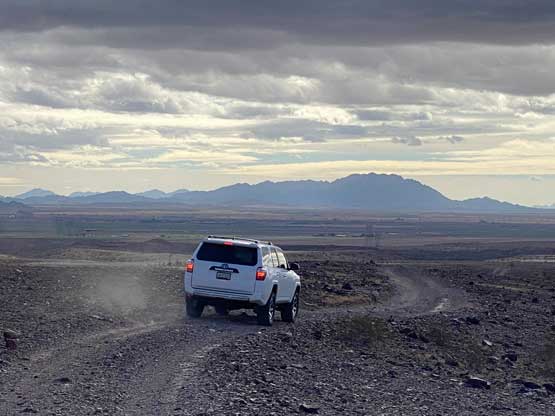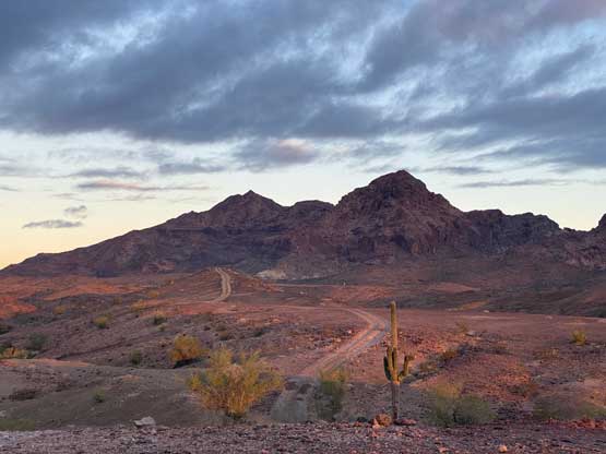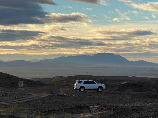 Matthias had also done his homework and his words were to drive in from the south. The three of us met in Wellton at about 6:30 am and drove north onto those dirt roads in two vehicles. About 1 km from the driveable end the road had become too steep/rough for Adam’s like, so we parked the Subaru and piled into Matthias’ 4Runner with monstrous tires. That vehicle is one of the best I’ve seen for mountainous accesses. We drove up and over one sketchy hill and some more rough spots and parked at where we were supposed to park. Apparently there’s some issues with this peak’s access so do your own research. Meanwhile the sky had been lit up by the Arizona’s gorgeous sunrise.