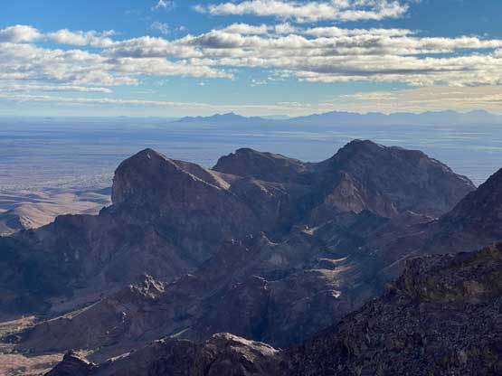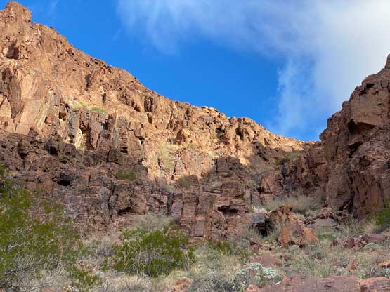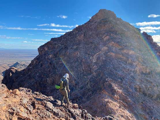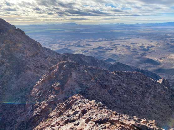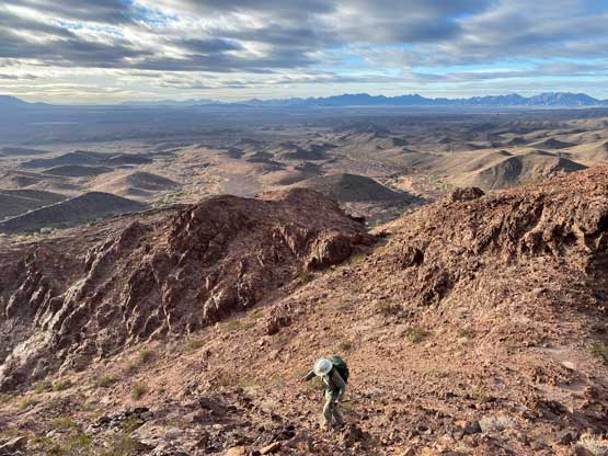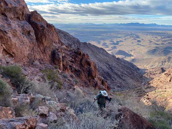 We talked about to descend a different route to close in a loop, but we couldn’t see the entire picture and the last thing we wanted was to get cliffed out. The decision was then made to retrace the same route despite that annoying 50-m side-hilling re-ascent. The descent of that gully was also not quite pleasant with some loose terrain and we also missed the easiest line down through that dry-fall and down-climbed some harder 3rd class steps. The rest of the return was uneventful and the entire hike turned out to be much shorter than anticipated. Given the time of the day we made the new decision to drive into the Castle Dome Mountains to scramble Thumb Peak in the afternoon, as otherwise we would have been wasting the previous daylight time.