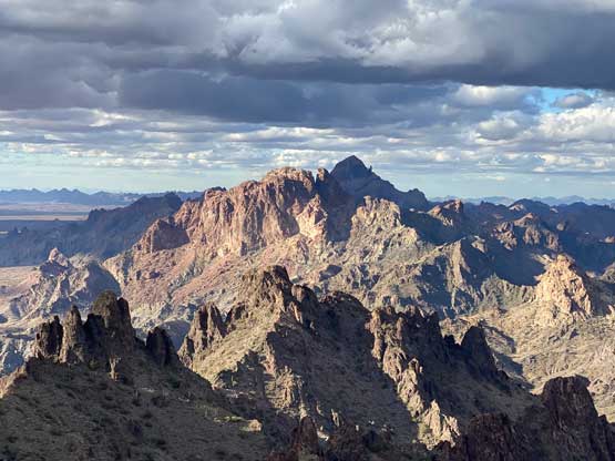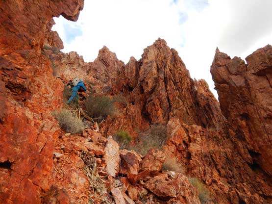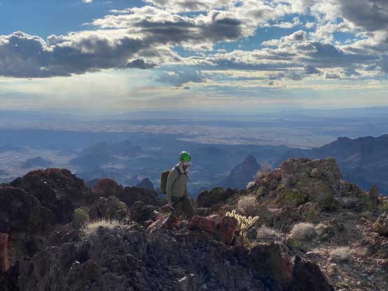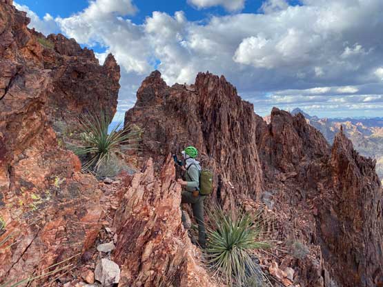 After getting onto the NE Ridge we soon realized that the scrambling was again, harder than expected with complicated route-finding on micro-terrain. The ridge was very broken with towers so we had to traverse on the south side for a while, dealing with a greater deal of loose rocks. At some point we had to regain the ridge so we scrambled a series of class 3 steps towards a higher notch. Continuing scrambling on the ridge from that notch appeared to be class 4, so I backtracked and down-climbed to the north side of the notch (exposed 3rd class) and found a nicer ledge to bypass the rest of the jagged towers. The others followed me to this ledge and we soon made to the uppermost east ridge. From here to the summit we no longer had route-finding challenges but we did have to scramble another tricky 3rd class step. Adam and Matthias kept saying that this peak should not appear on their secret “desert fun peaks” list. I could not comment since I’m not familiar with the rest of that list, but I did agree that the scrambling quality was not great, but on the other hand the views and the route-finding challenges still made this a worthwhile objective.