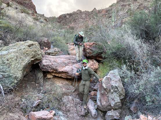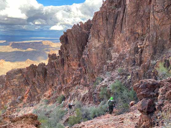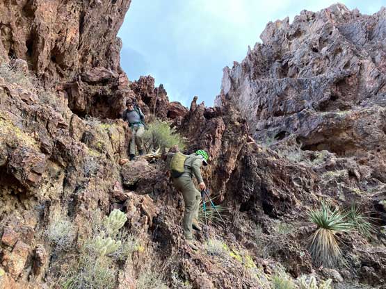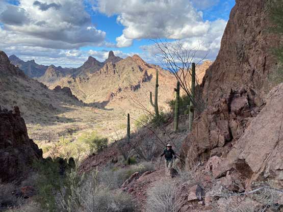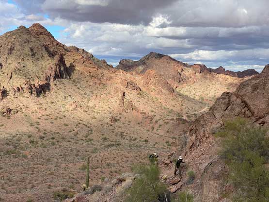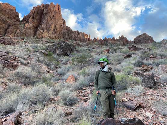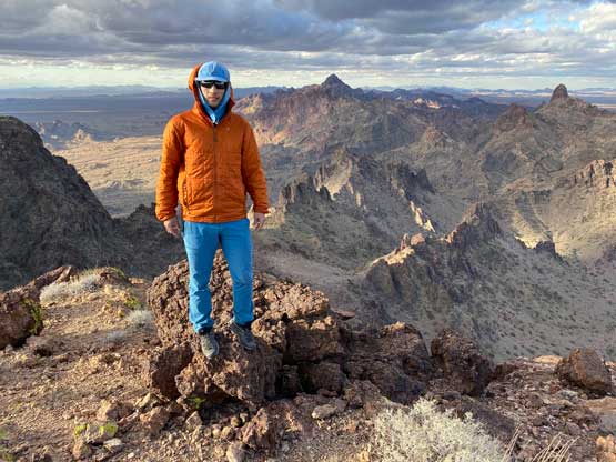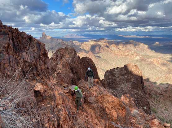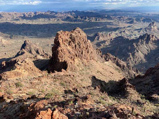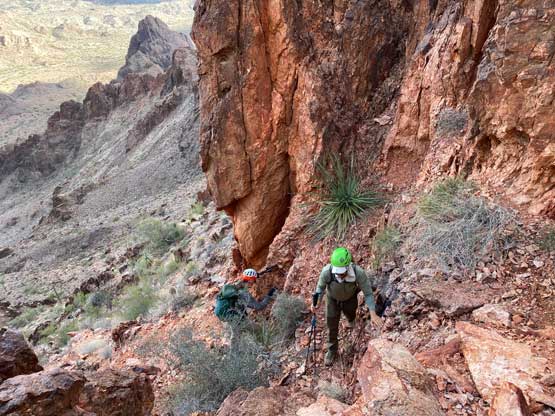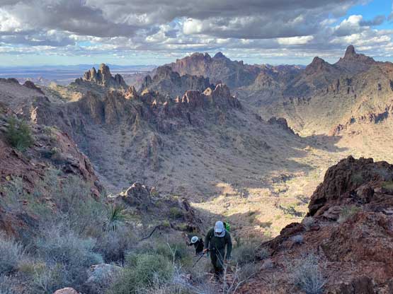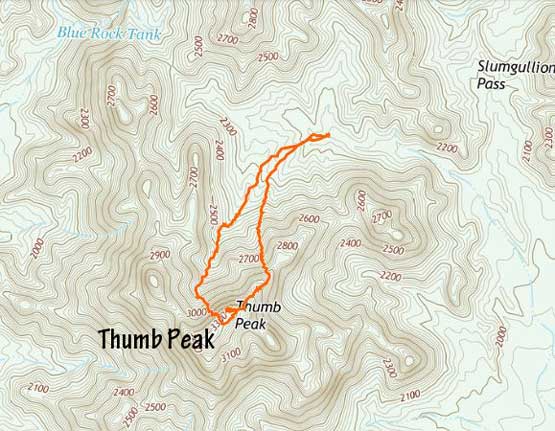 None of us seemed stoked to down-climb the route we just came up from but if that’s the only option then we had to. I spent a few minutes to match what I was seeing to the satellite and topo maps and decided to check out a potential alternative descent on the NW side of the summit. A few minutes later I concluded that it’s definitely doable and would get us to bypass all of the class 3 towers so down we went. We did have to down-climb that uppermost 3rd class step but immediately after that we made a side-hill traverse due SW towards another notch. This notch was not as sharp as the ones on the NE Ridge. From there the descent off the NW Face was very steep on mostly loose footings but did not involve anything worse than class 2 scrambling. Eventually we merged into a wash but the hike-out from this wash was long and tedious with a greater deal with bushwhacking. I was not yet used to the catclaws so I got quite a few scratches, but overall I think we did find a faster route to get off this mountain. If one aims for the easiest way to summit Thumb Peak then our descent route would be the one, but our ascent route was considerably more fun with a greater variety of terrain and scrambling.