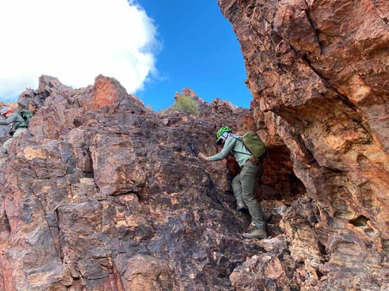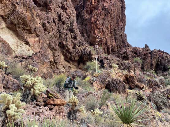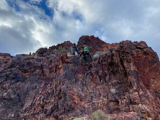 The Gaia’s map had been very correct about this drive-in so we never encountered any navigation difficulty. We showed up at the end of the road with at least half a dozen Jeeps and ATVs but none of them seemed to be there for hiking. From where we parked we only had about 1.5 km distance and 350 m elevation gain to the summit, so we did have plenty of time. None of us had done detailed research but we did come prepared with a screen shot of the route’s map, from Stav Basis’ website. Unfortunately Stav does not provide GPX files to download so we only had a rough idea where he went. The general bearing was to aim at a notch feature on the lower NE Ridge and follow the ridge to the summit with scrambling no harder than class 3. The ascent towards that notch was harder than appeared with lots of side-hilling on loose terrain. We also had to pay close attention to all sorts of the cactus plants as we were in a higher elevation zone than the previous few days that the slopes were much greener.