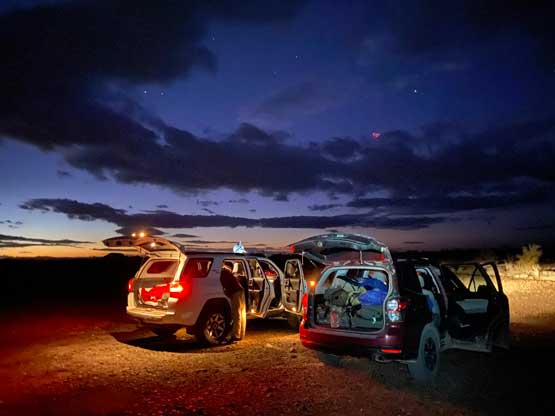 The challenge of this objective was not over yet as Matthias must drive us back out of that stupidly rough Big Eye Mine Road. At least now we no longer had to deal with the unknowns and we just had to be patient. Eventually after about 2 hours we got back to Adam’s Subaru and it was already dark. We decided to cook dinner right in that spot and then drive towards our next objective, Clifty Benchmark to set up camp somewhere there.