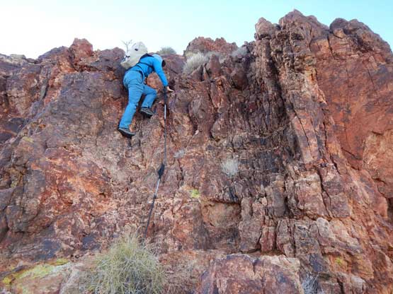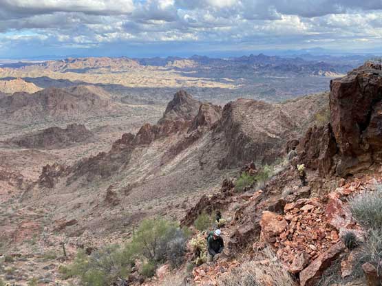 None of us seemed stoked to down-climb the route we just came up from but if that’s the only option then we had to. I spent a few minutes to match what I was seeing to the satellite and topo maps and decided to check out a potential alternative descent on the NW side of the summit. A few minutes later I concluded that it’s definitely doable and would get us to bypass all of the class 3 towers so down we went. We did have to down-climb that uppermost 3rd class step but immediately after that we made a side-hill traverse due SW towards another notch. This notch was not as sharp as the ones on the NE Ridge. From there the descent off the NW Face was very steep on mostly loose footings but did not involve anything worse than class 2 scrambling. Eventually we merged into a wash but the hike-out from this wash was long and tedious with a greater deal with bushwhacking. I was not yet used to the catclaws so I got quite a few scratches, but overall I think we did find a faster route to get off this mountain. If one aims for the easiest way to summit Thumb Peak then our descent route would be the one, but our ascent route was considerably more fun with a greater variety of terrain and scrambling.