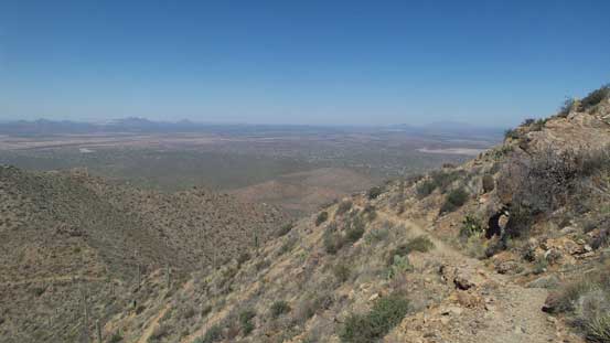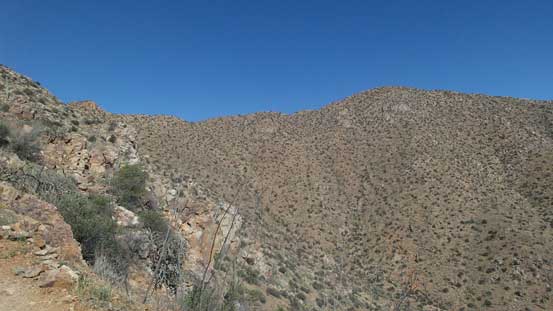 One thing that makes this peak stands out is the endless Sonoran Desert scenery with saguaros everywhere anywhere. Eventually I got tired out taking those pictures so just went on. The plod through King Canyon seemed like quite a drag but mostly due to the temperature. The bulk part of the elevation gain didn’t start until a couple miles into the trip when the trail ascends out of King Canyon towards a high saddle where it’ll meet Sweetwater Trail. I took a long break just above the saddle as I was seriously running out of energy in this heat. Most others hikers were coming down already suggesting I should have started a couple hours earlier.