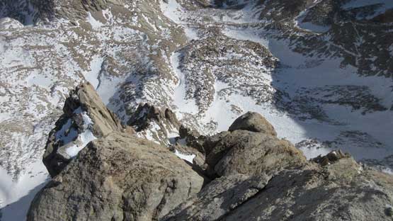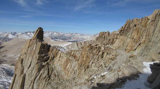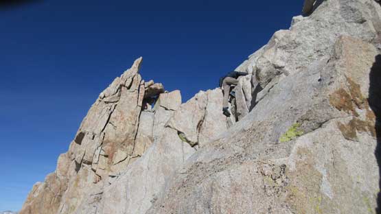It’s very obvious as where to leave the trail as long as you’ve done some sort of research. To get to the summit block was just an “easy scramble” on talus and scree. There’s plenty of route information for the 3rd class section on this final pitch but once there the route-finding is actually quite simple. We pretty much just followed our basic sense and the natural flow and the route just worked out. There’s one trickier “hand traverse” about halfway up and then to get onto the true summit we had to squeeze up a “hidden chimney” on the backside. Both steps would qualify a “WA 4th class” or “BC 4th class” grade but here in California the rating is lower (3rd class).