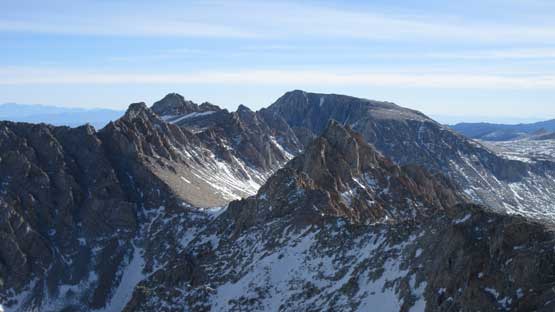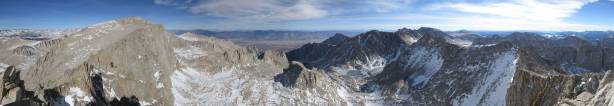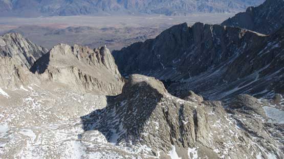 Thank to the pinnacle nature of this summit the view was actually more far-reaching compared to from Mt. Whitney. The lighting was gettin’ better too as that thin layer of high clouds was dissipating so we actually lingered for quite a while. The descent was straightforward. We didn’t want to fancy about the route so just simply retraced our exact ascent line. In no time we were back to where we ditched the backpacks.